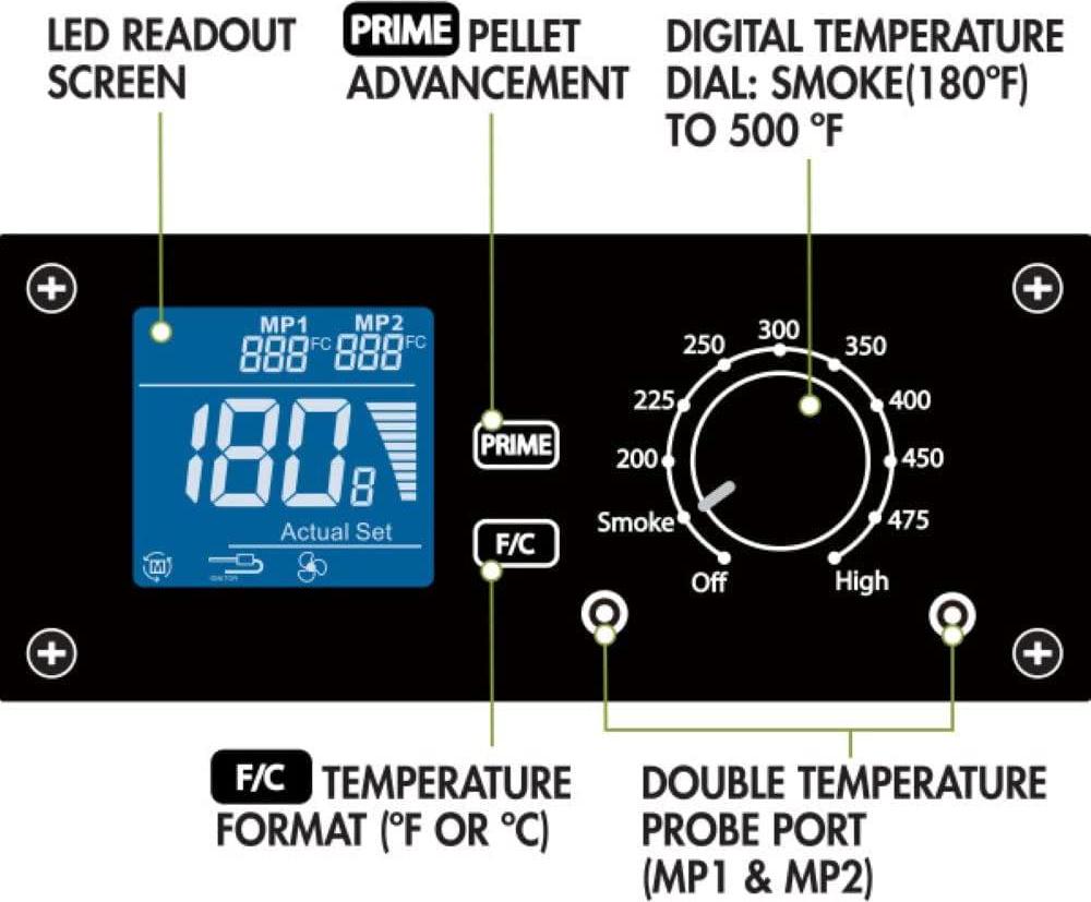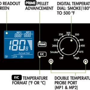 – ADVANCED WOOD FIRE TECHNOLOGY: With a wide temperature range from 180°F to 500°F, the digital control regulates the system and the 2- food temperature probes. PRECISION PELLET DELIVERY SYSTEM: Automatically adds pellets as needed to regulate the temperature for consistent Heat and Smoke. DIGITAL CONTROLLER: Electronic auto-start ignition, digital auto temperature control and real-time LED temperature display.