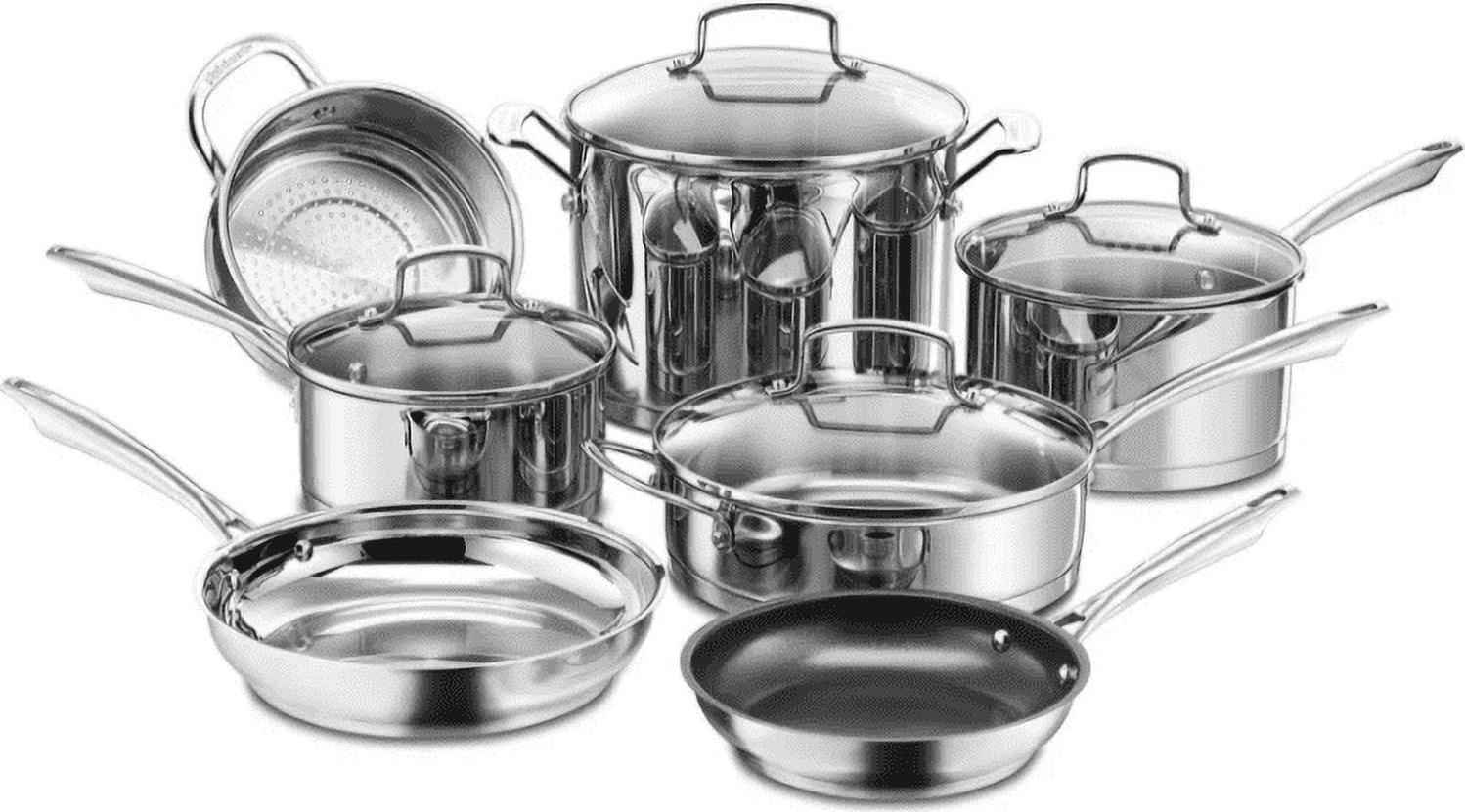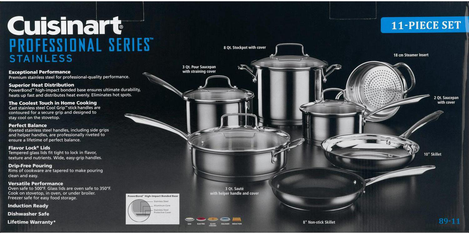 Set Elegant and contemporary, this gleaming 11-piece set is perfect for beginner cooks or gourmet chefs. It includes all the essential pots and pans to outfit a chef’s kitchen and so much more! Stainless steel heats evenly, and tempered glass Flavor Lock lids seal in heat, moisture and flavor. Cook like a pro with this professional stainless steel cookware from Cuisinart.