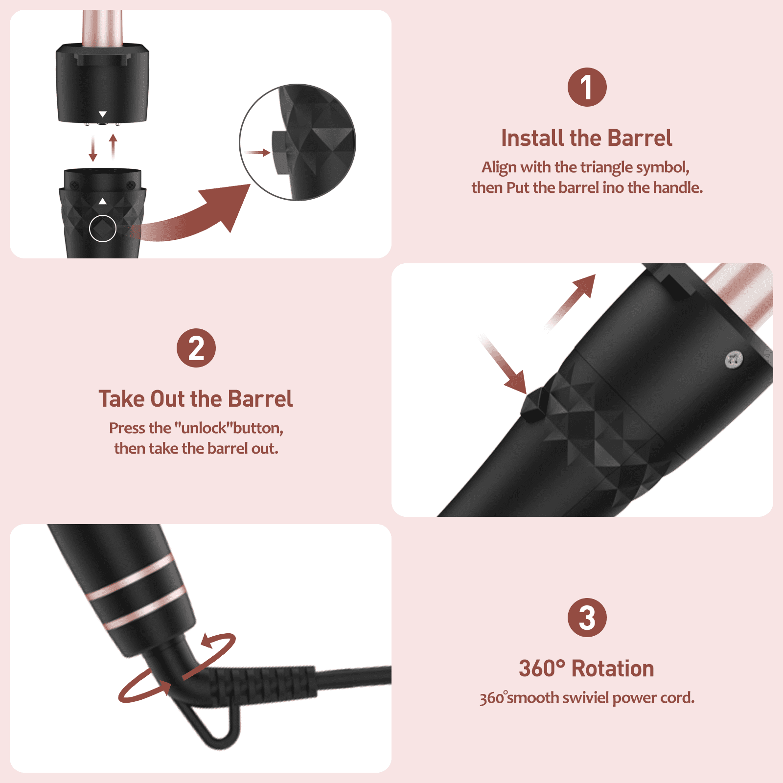 PTC fast heating components+ Ceramic coating for barrel+ Tourmaline Emits Negative Ions+PET material for handle+360°swivel cord.