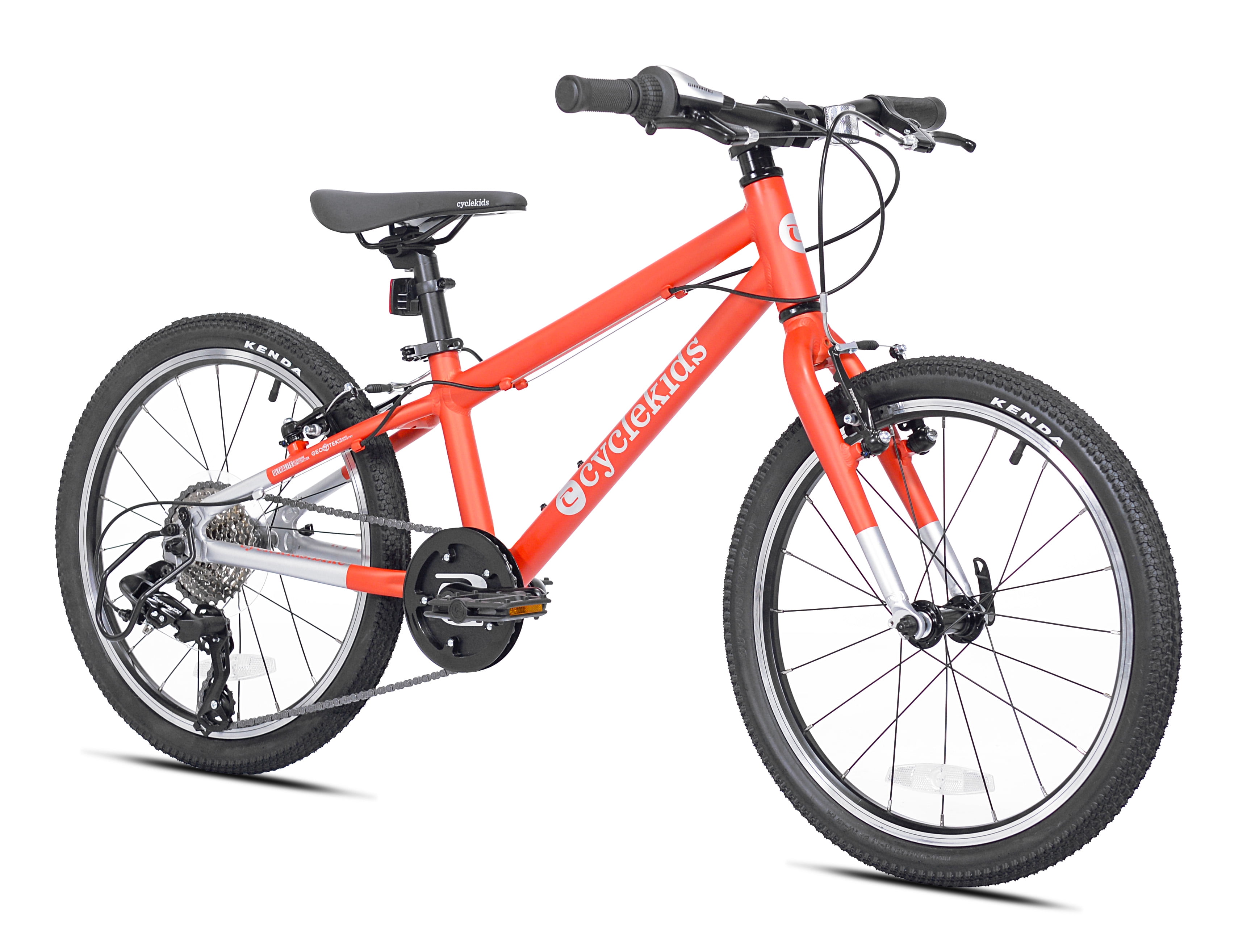 The 20” CYCLE Kids bike is the perfect introduction to gears. It weighs only 19.5 pounds and features an easy-to-use 8 speed twist shift drivetrain. It’s equipped with ultra lightweight, rust proof components and is easily adjustable for the perfect fit. Front and rear Tektro hand brakes provide excellent stopping power and the rear guard protects the derailleur from damage. A great option for all neighborhood rides! Child age group.