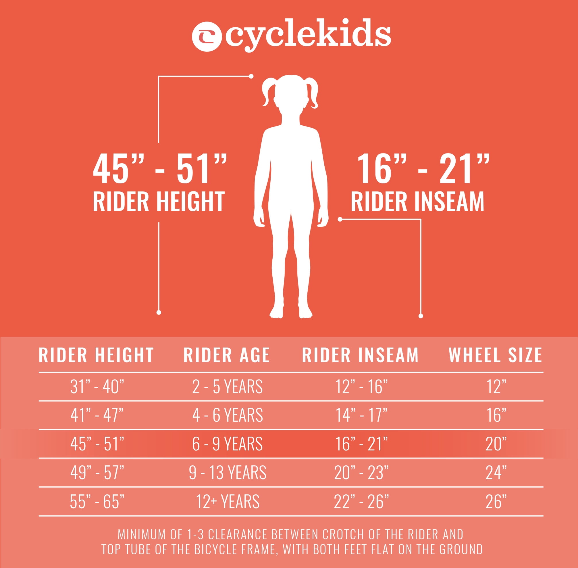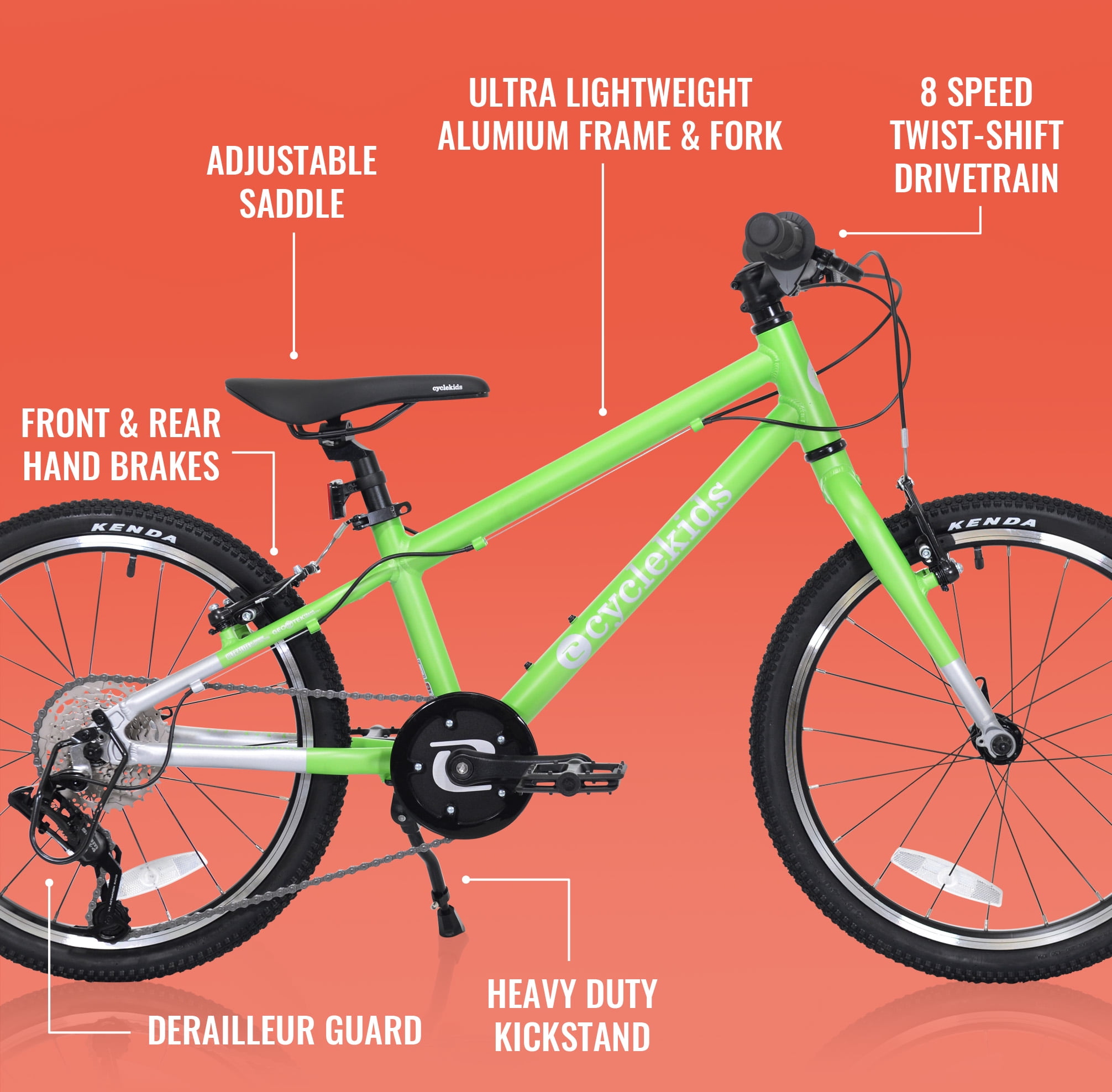 The 20” CYCLE Kids bike is the perfect introduction to gears. It weighs only 19.5 pounds and features an easy-to-use 8 speed twist shift drivetrain. It’s equipped with ultra lightweight, rust proof components and is easily adjustable for the perfect fit. Front and rear Tektro hand brakes provide excellent stopping power and the rear guard protects the derailleur from damage. A great option for all neighborhood rides!