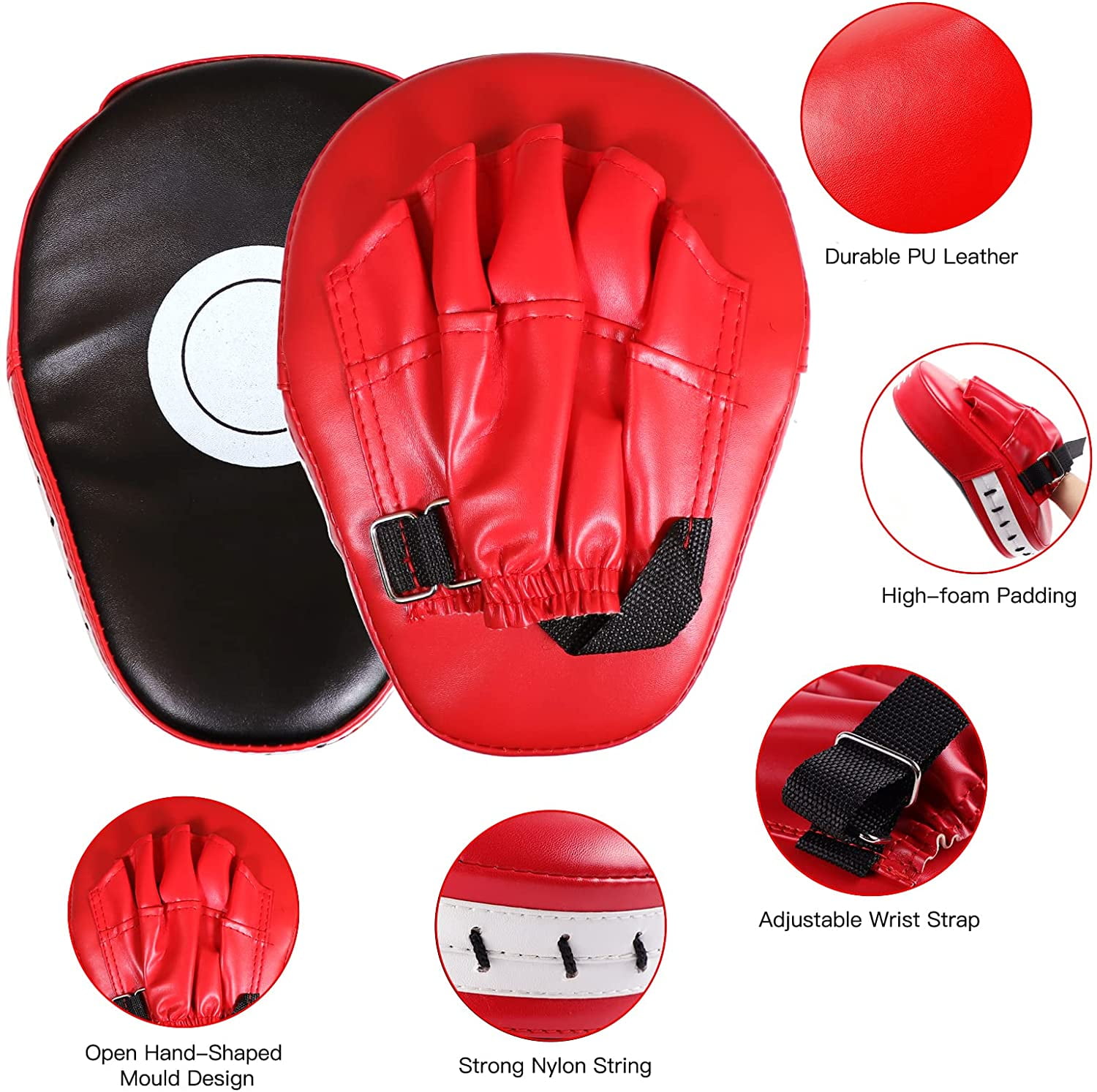 Large 5-piece curved polyurethane (PU) elbow blocking mitt kit includes a kick pad, 2 punching mitts, and 2 boxing gloves for a complete kickboxing training set Kick pad features a large striking area, strong nylon string sewing, high-density raw sponge interior, and a comfortable PU solid handle with length-adjustable buckle design Boxing gloves are designed with premium padded foam, hand-molded shape, locked thumb feature, loop wrist straps, and air vent holes for a secure and comfortable fit Punching mitts are made of durable PU leather with high-foam padding, adjustable wrist straps, strong nylon string, and an open hand-shaped mold design Ergonomically designed with high-quality materials like thickened foam filler and PU leather for effective shock absorption and protection Breathable design on the punching mitts reduces sweat flow during training, and the curved shape fits most trainers’ hands comfortably Ideal boxing training set for kids, youth, and adults, suitable for a wide range of martial arts and fitness activities including MMA, UFC, kickboxing, karate, Muay Thai, and more