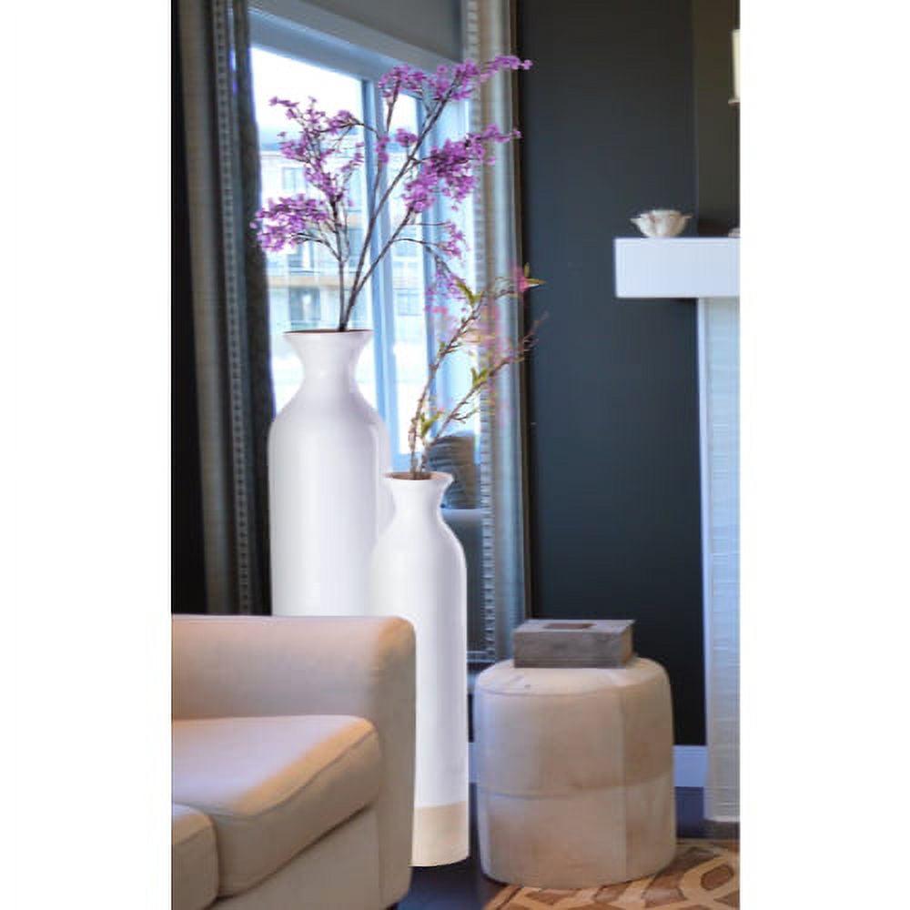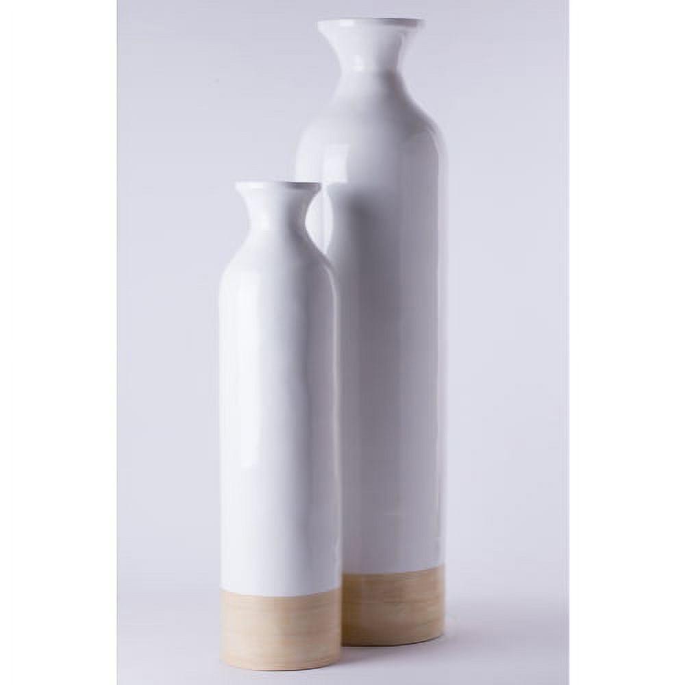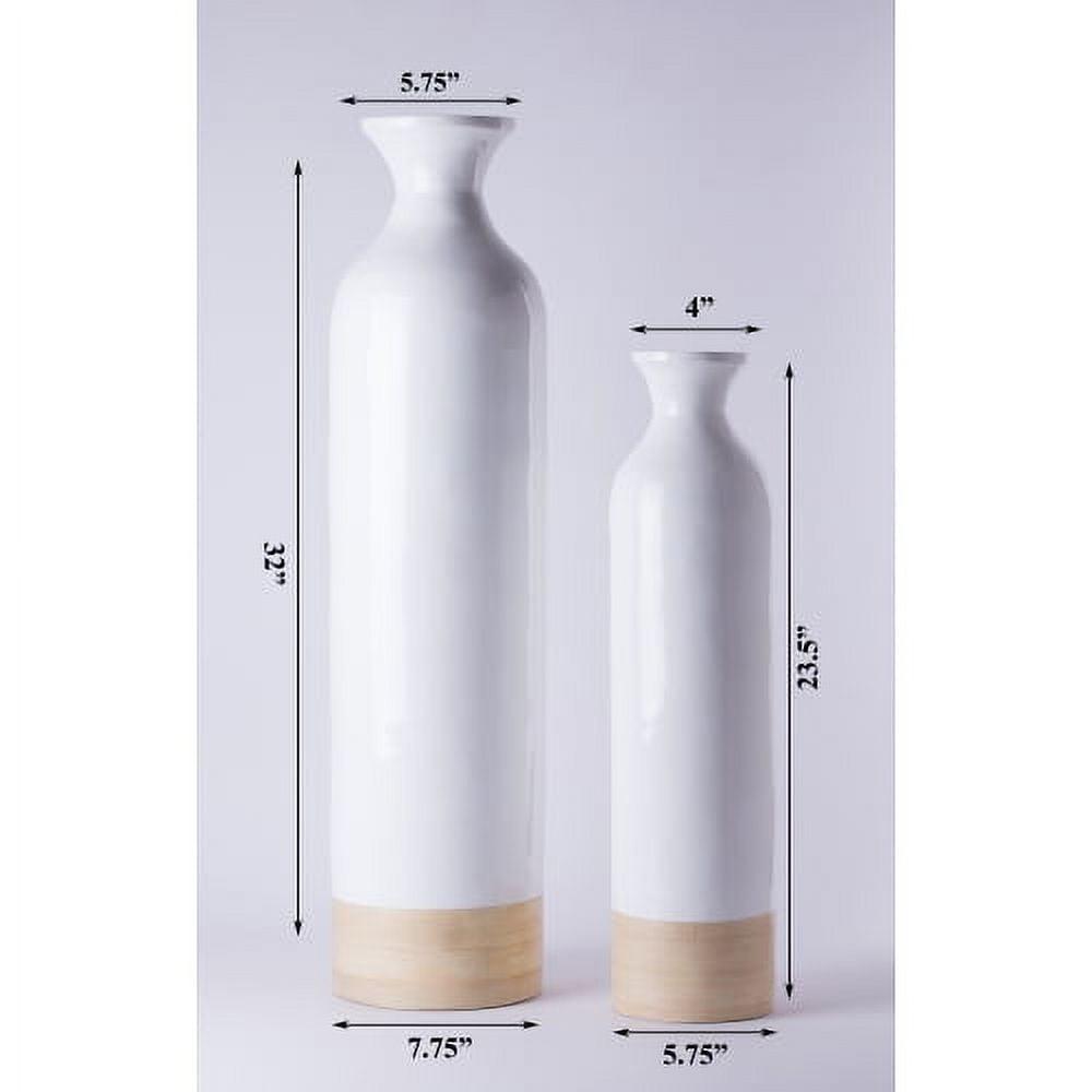 Cylinder Shaped Tall Spun Bamboo Floor Vase Glossy White Lacquer and Natural Bamboo Finish, Set of 2
