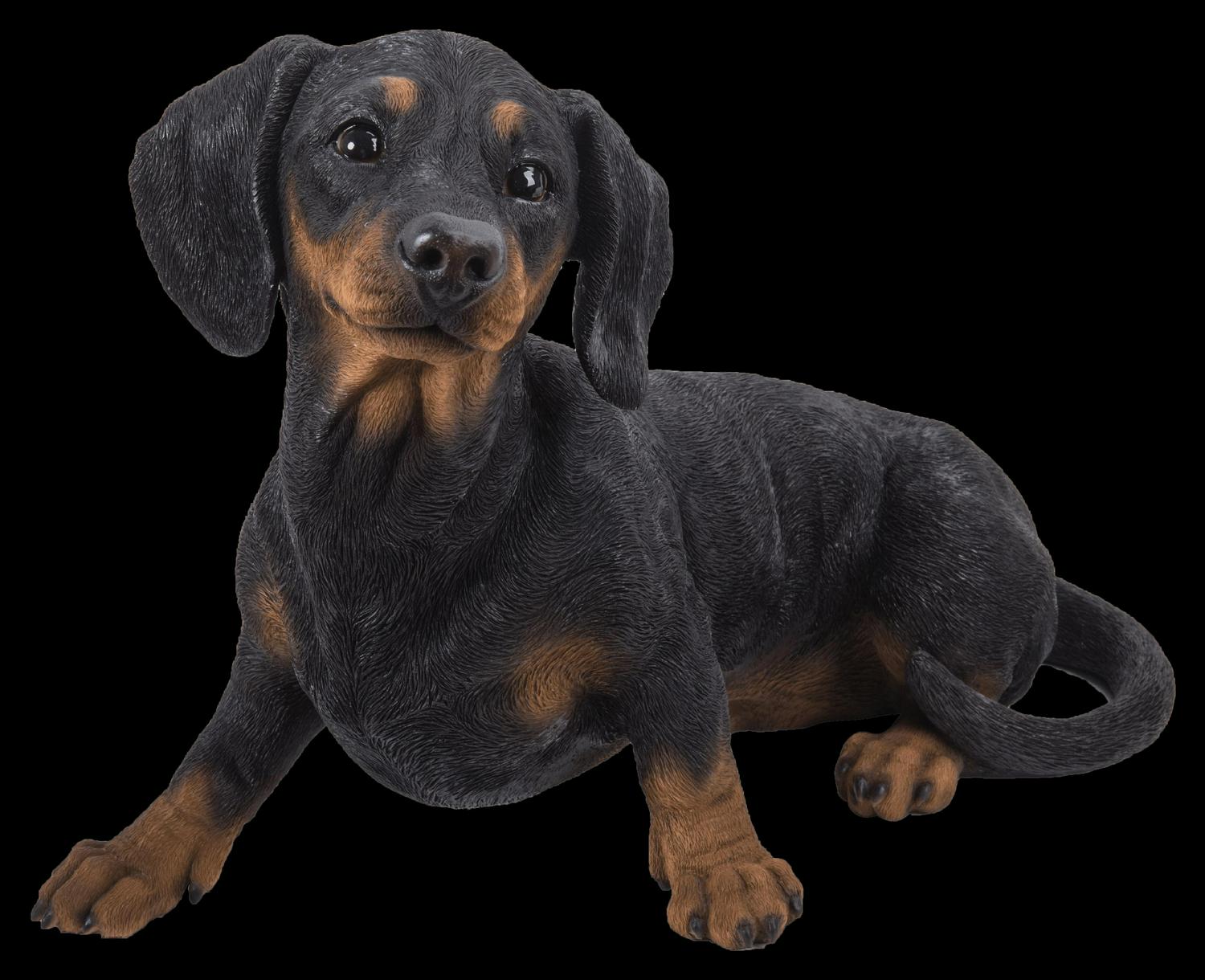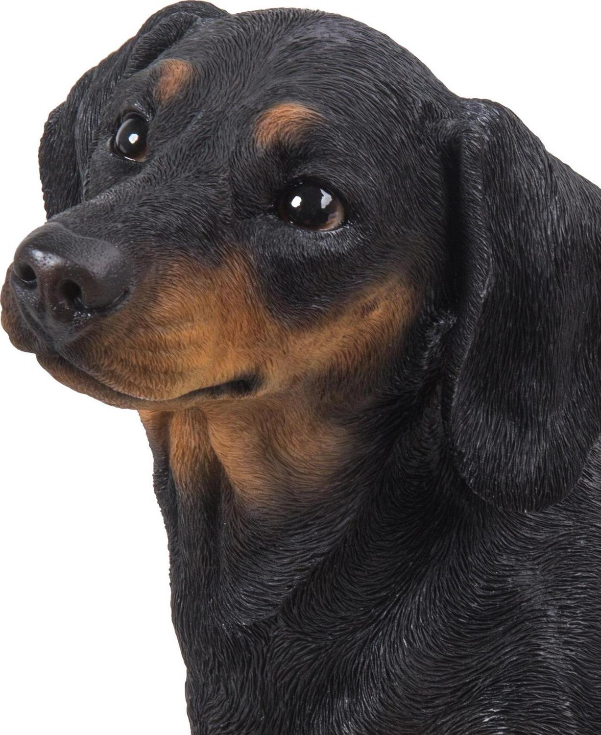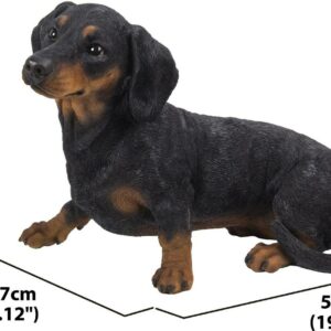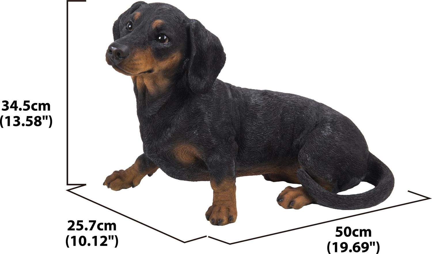 This irresistable dachshund has a refined dark coat. True to life glossy brown eyes are staring out. This realistic depiction of man’s best friend is made with polyresin, and is perfect for both indoor and outdoor exhibit. Makes a great gift for dog lovers. Size: 13.5″ High Composition: Poly-resin Color: Black/Brown