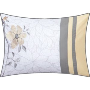 Transform your bedroom into a fresh and lively space with the Dahlia 12 Piece Comforter Set in Queen size. The intricate large-scale floral embroidery over a botanical leaf print adds a touch of elegance to this modern style comforter set. The soothing palette of white, pale yellow, and grey is complemented by two soft and subtle embroidered decorative pillows. Made of durable polyester, this set includes a 4 piece comforter set, two Euro shams, two decorative pillows, and a 4 piece sheet set.