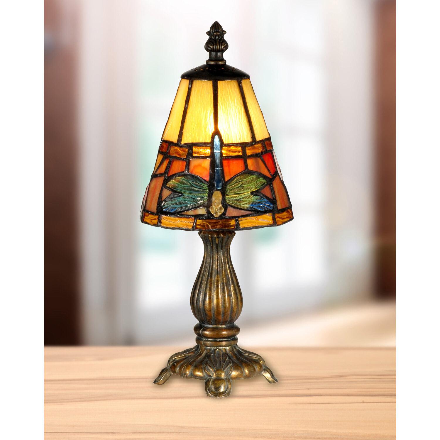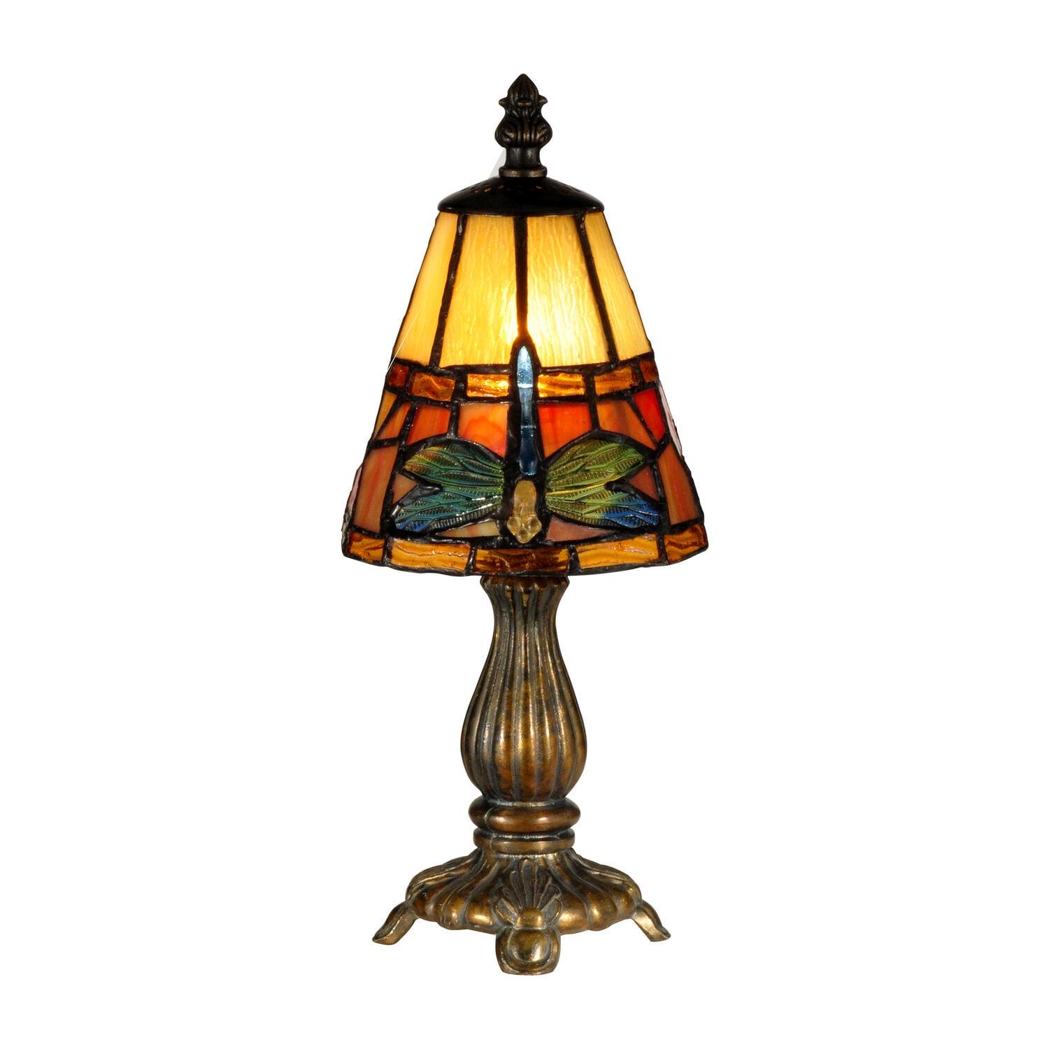 A modern twist on a classic Tiffany design, our Cavan accent lamp will glow brightly in any room in your home. The top of the cone shade is sunny amber art glass panels. A broad band of fiery orange, red and dark amber runs along the bottom edge. Large dragonflies with cool, iridescent blue green bodies and light amber heads provide crisp contrast to the warm earthen tones. The elegant metal base features a reeded column and intricately cast pedestal with fan detailing. Cavan easily accents any decor style and will add a bright splash of color o your home or office for many years to come.