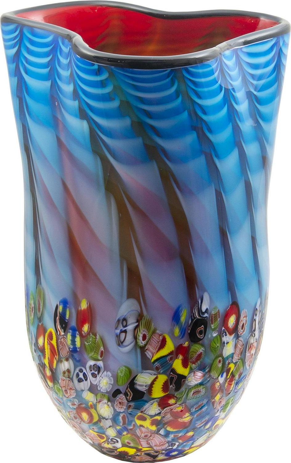 Vibrant colors and textures make our Tangelo Hand Blown Art Glass Vase an easy way to add a brilliant splash of color to any room. This pretty free form vase features a background of ocean blue that is accented with waves and ripples throughout to create a sense of movement. Around the bottom, an abstract design in bright yellow, blue, white, amber, and orange creates an impression of aquatic life swimming below the ocean s surface. The interior wall is bright amber, which perfectly complements the exterior design. The vase is crafted entirely of hand blown Favrile art glass. This means that no 2 pieces are exactly alike and ensures yours is a one of a kind. A bright choice to display a large arrangement of your favorite flowers on a dining table or buffet, our Tangelo Hand Blown Art Glass Vase also makes a brilliant gift for any occasion. NOTE: Due to the nature of handmade art glass, colors, sizes and patterns may vary slightly.