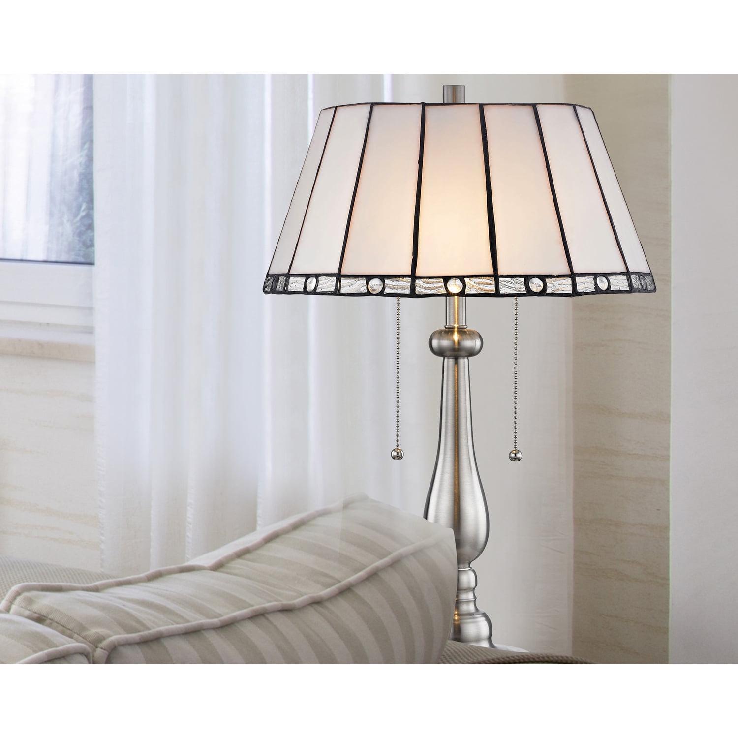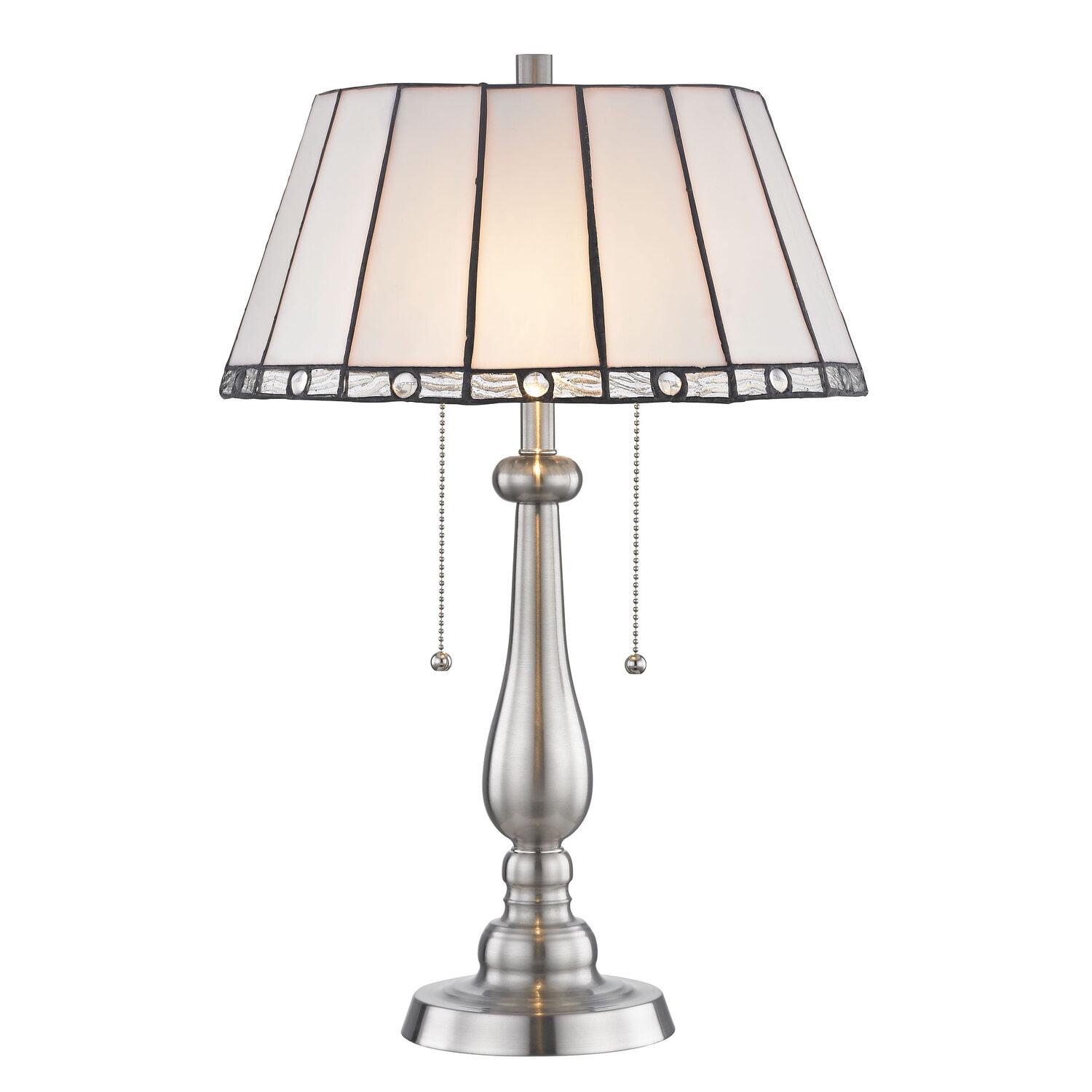 Our lovely Adrianna Table Lamp features an icy monochromatic beauty that will easily assimilate into any decor. The gently flared drum shade is crafted of panels of iridescent alabaster art glass that is separated by bold filigree to create definition and contrast. Each panel features a horizontal rectangle of silver art glass at its bottom edge that creates an icy border that runs around the shade. A clear glass gem at the center of each piece adds texture and extra sparkle when Adrianna is illuminated. The metal base is finished in cool Satin Nickel and is enveloped with an elongated glass teardrop and decorative column breaks to add to the icy crispness. A matching pedestal round and finial complete the look. A lovely addition to end tables or nightstands, our Adrianna Table Lamp is destined to become a cherished family favorite.
