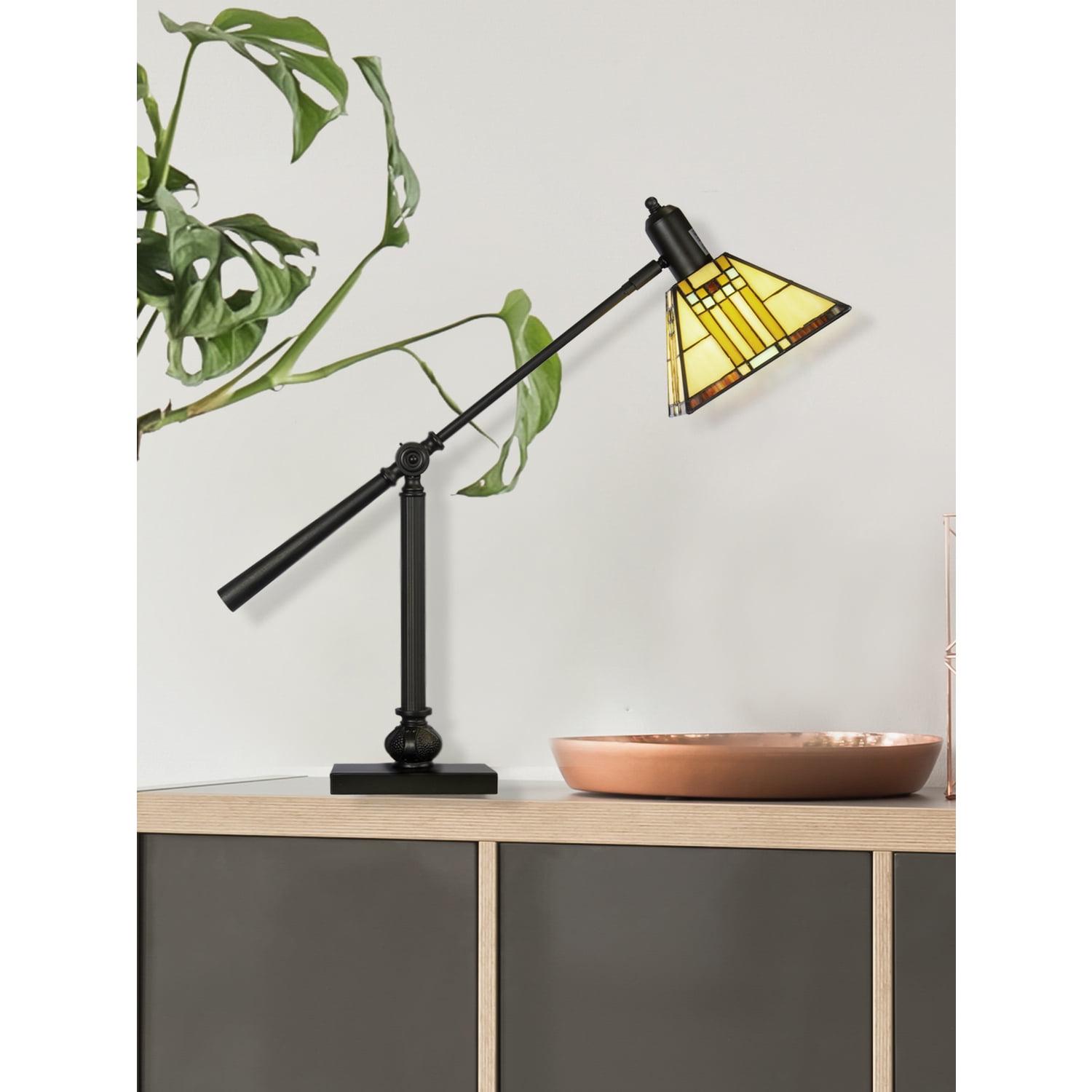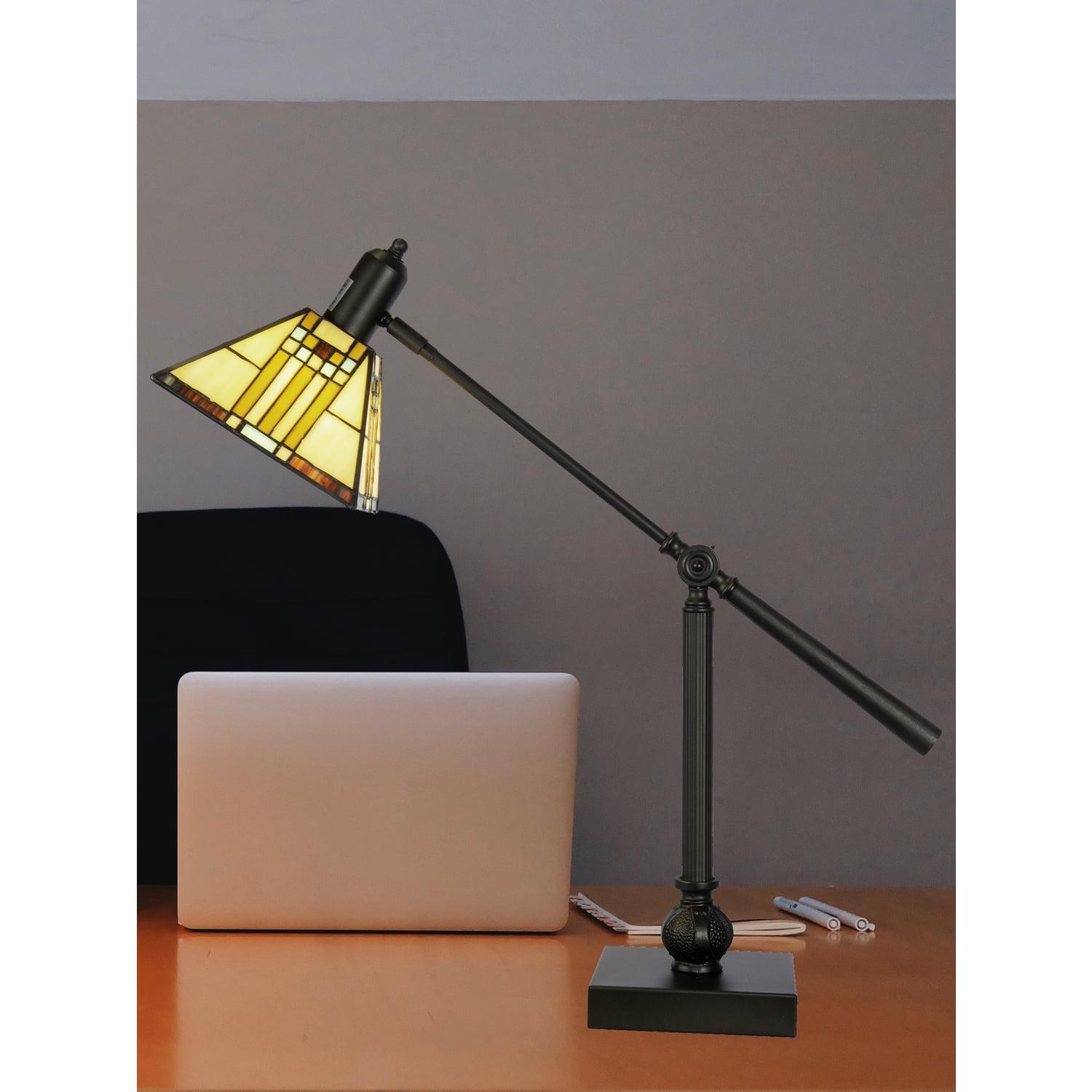 Both attractive and functional, the Mission bank table lamp features more than 100 pieces of art glass, each individually hand rolled and set in copper foil. The mission style shade is done in a traditional window pattern in beige, blue, red and butterscotch. The base is a classic reader style with a fully adjustable arm and is finished in mica bronze.