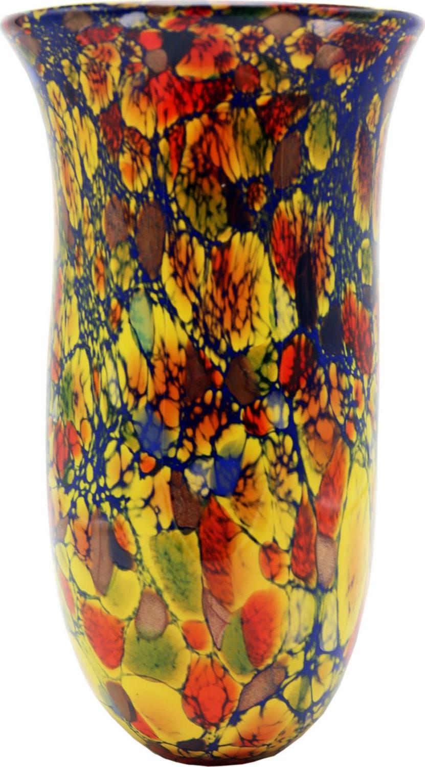 Our festive Solana Hand Blown Art Glass Vase is sure to become the focal point in any room in which it is displayed. The tall, column vase features a base of bright amber with a pattern of allover splotches in amber, green, black, red, and blue. Black accents are then added throughout for added definition and visual interest. The wide mouth allows for large arrangements of tall flowers. Solana is hand blown using Favrile art glass that was first developed by L.C. Tiffany in the late Nineteenth Century. A commanding presence on a larger dining table, console, or buffet, our Solana Hand Blown Art Glass Vase makes an excellent housewarming or bridal gift whose recipient will proudly display for many years to come. NOTE: Due to the nature of handmade art glass, colors, sizes and patterns may vary slightly.