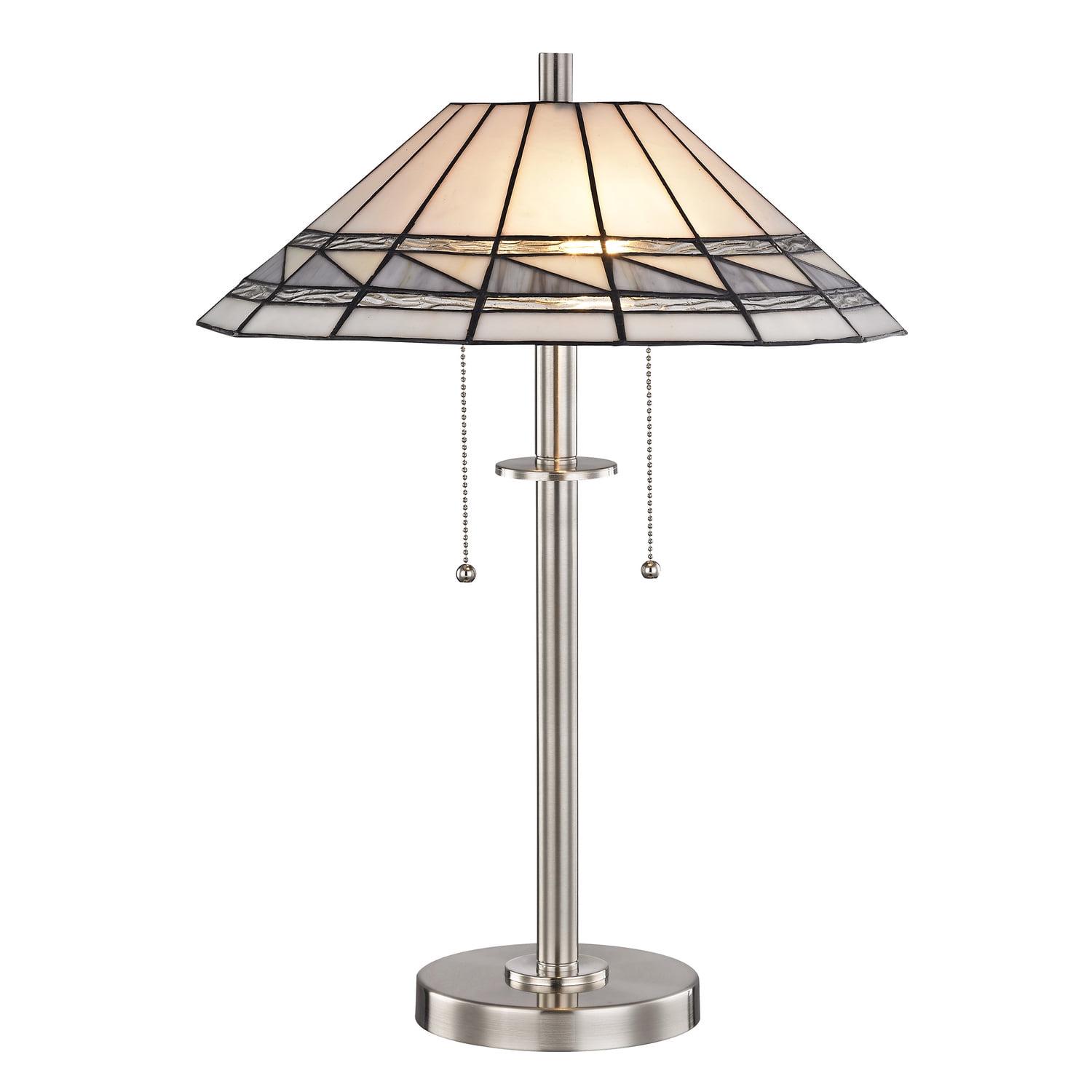 The gentle, cool tones of our Sasha Table Lamp will easily assimilate into any decor in your home or office. The conical shade is crafted of large wedges of creamy natural art glass that are set in dark filigree. A geometric pattern of obtuse triangles in alternating natural and delicate silver blue are bordered top and bottom by rows of frosted glass rectangles that both frame the triangles and add texture. The shade has no vase cap, which allows the lamplight to escape out the top for extra room light when Sasha is lit. The sleek metal base, pedestal round and matching finial are finished in shimmery Satin Nickel, which adds the overall sleekness of the design. A perfect choice on matching nightstands or end tables, our Sasha Mosaic Table Lamp s fashion forward design will light your home or office well into the 21st Century and beyond.