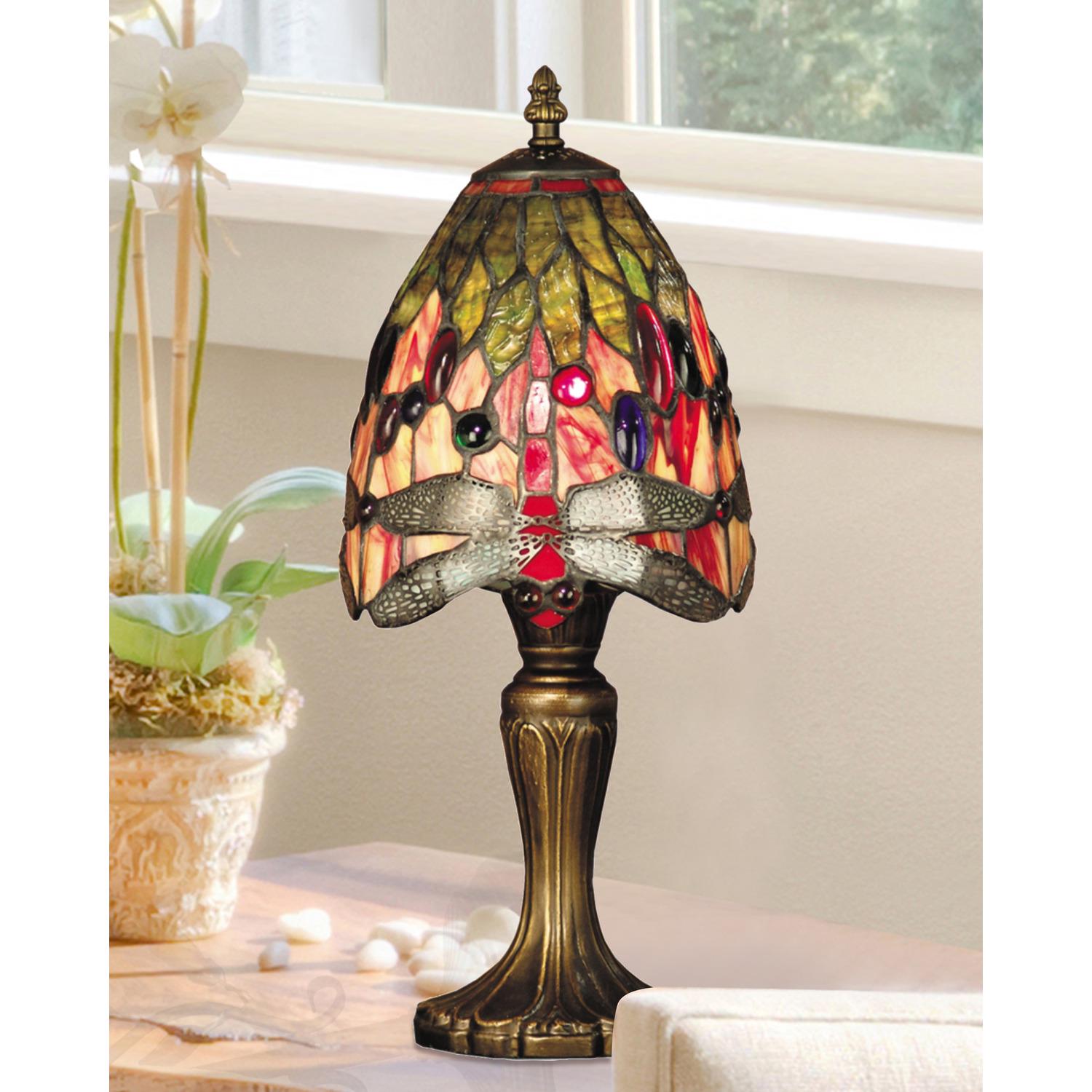 Taking their inspiration from Tiffany s love of nature, our artisans have created the Vickers table lamp. 120 pieces of art glass and art glass jewels represent a weeping willow style tree in greens, pinks, reds, blues and amber. Tiffany s signature dragonfly runs along the bottom rim of the shade, exquisitely recreated in a fine filigree overlay. The simple metal pedestal base, finished in antique brass provides the right contrasting balance for this table lamp, which will work well in any room of your home or office.