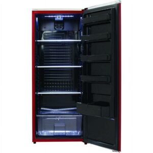 Drawing inspiration from mid-century styling and simplicity, Danby patented Contemporary Classic collection of refrigerators reimagine retro for the modern consumer. Featuring Danby exclusive retro-inspired curved door design, red metallic door and chassis finish, rubber-grip ergonomic chrome handle and stylized chrome worktop, its exterior features are only outmatched by its signature black interior. Boasting 11 cubic-feet (311 liters) of storage and cooling space, it features three chrome-trimmed tempered glass shelves and five integrated door shelves for maximum storage versatility. There more than enough room for larger bottles and the spacious unit helps keep electricity bills in check with its Energy Star rating and state-of-the-art mechanical thermostat. Maintenance and cleaning are as simple as can be with the automatic defrost system. It also includes an efficient and reliable interior white LED light. This model is built for convenience as the reversible door hinge allows you to adjust it for either left or right-handed opening.
