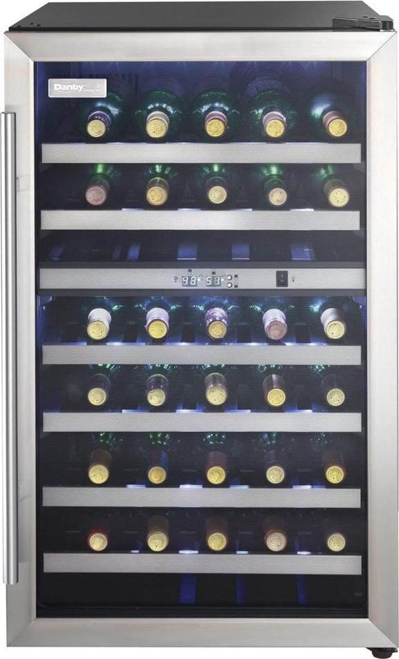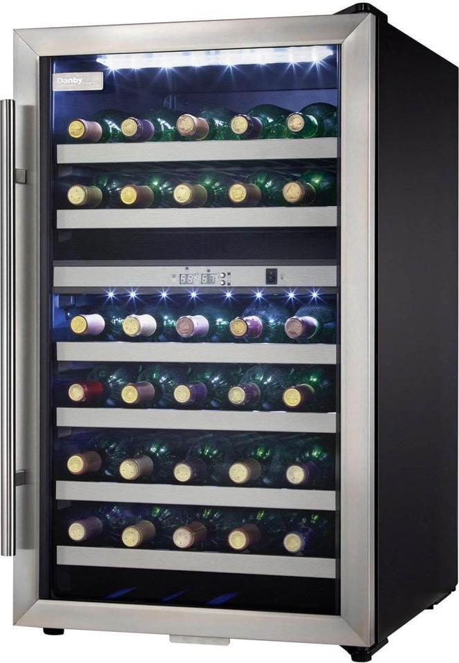 With the Danby Designer 38-bottle free-standing dual-zone wine cooler, you can store up to 38 bottles of wine in two distinct, separately regulated temperature zones for red and white wine storage. A reversible tempered glass door helps to protect the wine from harmful UV rays. White LED interior lights beautifully showcase the wine without the heat of an incandescent bulb. The all black cabinet with stainless steel trimmed glass door provides a contemporary look and the towel bar style door handle adds a stylish touch.