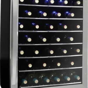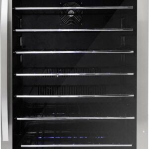 The serious wine aficionado will appreciate this chic wine cooler with its 5.7 Cu. Ft. 60-bottle capacity. It can be used as either a freestanding or built-in unit and comes with a temperature range between 5°C and 18°C (41°F and 64°F). The thermostat is precise and easy to read with its electronic LED display unit. This enables you to easily program and monitor the temperature of the cooler at all times as it can easily be seen through the stylish tempered-glass door. The wine is kept cooler with the presence of an incandescent light bulb and there s plenty of room for your favorite brands due to the 6.5 sliding black-wire shelves. The door also features a stainless steel handle and frame and the convenient reversible hinge allows you to set it for either left or right-hand opening. The wine cooler also comes with in-home service on its 12-month parts and labor warranty.