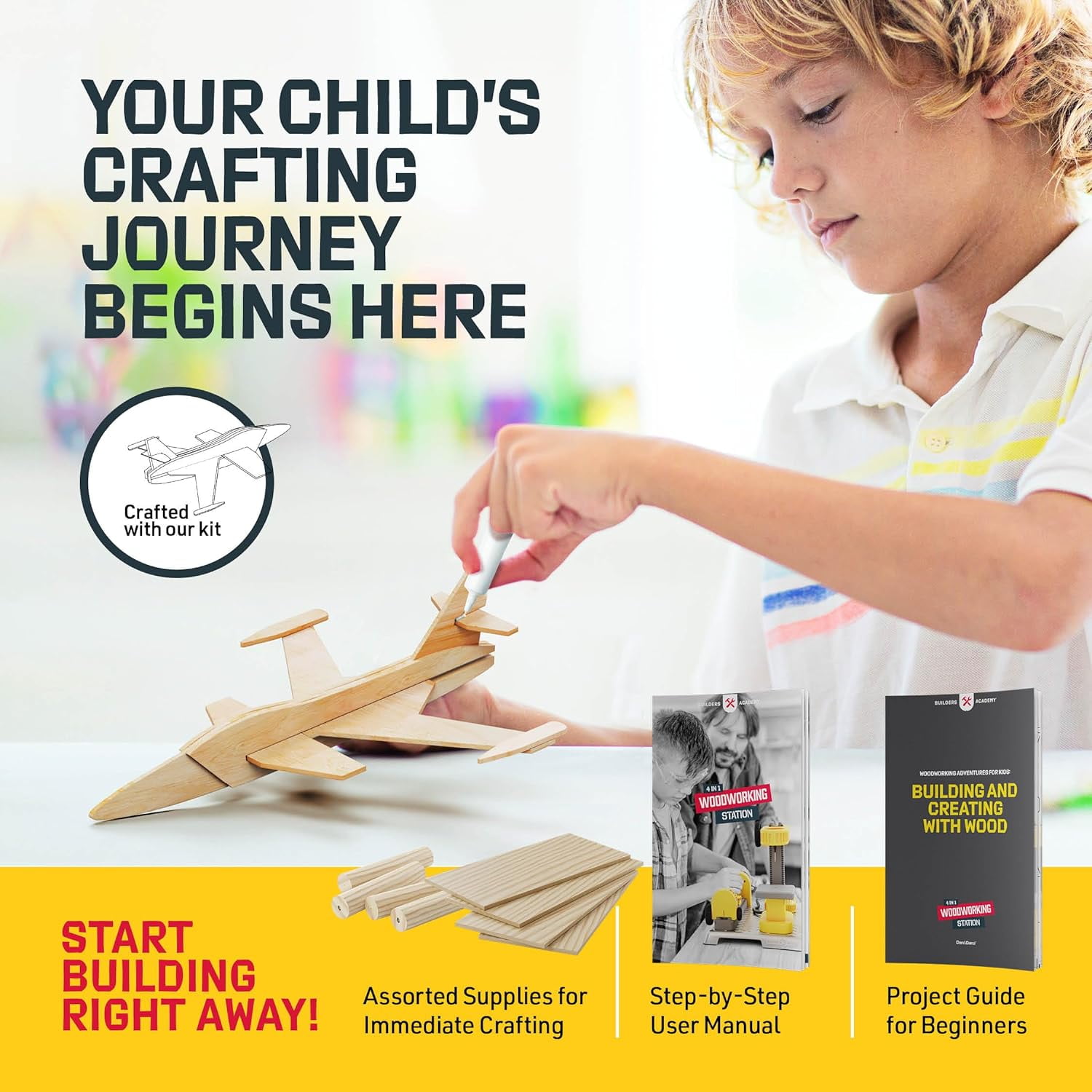 SAFE & FUN WOODWORKING: Introduce your child to the joy of woodworking with the Dan&Darci Woodworking Station! Designed specifically for kids, this 4-in-1 station includes a Jigsaw, Lathe, Drill, and Sander. Each tool is engineered for safety, ensuring a worry-free experience for parents and endless crafting fun for young builders. ALL-IN-ONE CREATIVITY HUB: Unleash your child’s creativity with a single, convenient station. Whether it’s cutting with the jigsaw, shaping with the lathe, drilling precise holes, or creating smooth finishes with the sander, this is a complete package for a variety of projects. BEGINNER-FRIENDLY TOOLS: Empower your child with tools that are not just safe but also easy to use. Our user-friendly design encourages young builders to learn and grow their carpentry skills, turning their imaginative ideas into tangible, handcrafted masterpieces. STEP-BY-STEP LEARNING: Follow our detailed, illustrated manual and project booklet to create your own wooden airplane from scratch! These easy-to-follow guides are perfect for teaching the basics of woodworking, ensuring a rewarding and educational experience. READY TO START: Jump into woodworking right away! The kit comes with wooden planks and cylinders, allowing kids to start their first project immediately. The hands-on experience is perfect for developing fine motor skills and fostering a sense of accomplishment. INSPIRE YOUNG ARTISANS: Perfect for kids interested in DIY and crafting; this woodworking station is more than a toy — it’s a gateway to skill development, creativity, and love for hands-on learning. It’s an investment in your child’s future as a budding artisan. DURABLE & HIGH-QUALITY: Crafted with durability in mind, our Woodworking Station is made from high-quality materials. It’s built to withstand the enthusiasm of young carpenters, ensuring a long-lasting addition to your child’s creative toolkit.