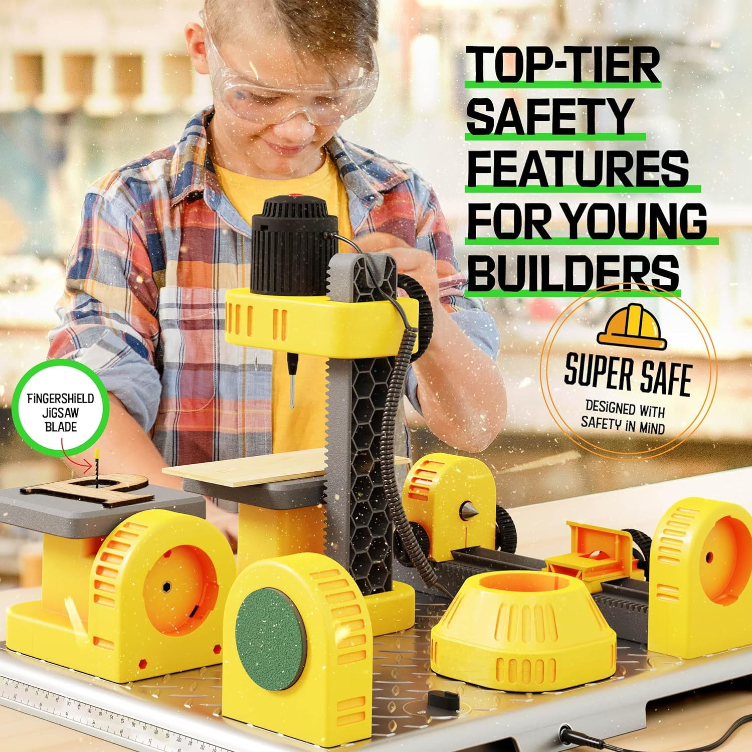 Meet the Dan&Darci 4-in-1 Woodworking Station: A Kid’s Dream DIY Set! Welcome to the world of fun and safe DIY! The Dan&Darci Woodworking Station is perfect for kids 8 and up. It’s a safe way for them to learn and play. This set lets kids dive into DIY projects with tools made just for them. It includes a Jigsaw, Lathe, Drill Press, and Sander. All are safe and easy to use. The tools come in bright yellow and black, making them look cool and showing kids where to work safely. We also include safety gear to keep your little builders secure as they create, build, and learn. This set is great for any young DIY fan. It helps them grow their skills and have a blast. It’s also perfect for learning STEM basics through crafting. Give your child the joy of real woodworking with this awesome set. It’s all about making and learning in the safest, most fun way possible!