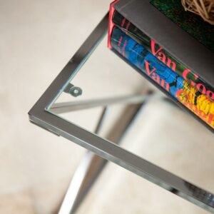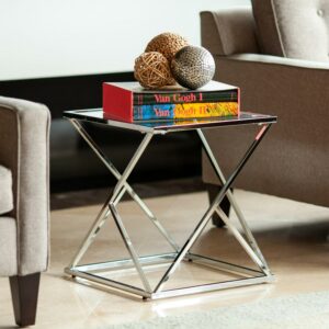 Taking inspiration from modern design, this elegant Danya B. Square Polished Chrome End Table with Clear Glass top impresses with its slender and lustrous geometric polished metal frame. The sleek clear glass top provides an attractive juxtaposition to the shiny metal frame. Prop the Danya B. Square Polished Metal End Table with Clear Glass top in contemporary living rooms as an accent piece you and your guests will surely love. Danya B. is a registered trademark of Danya B Inc.