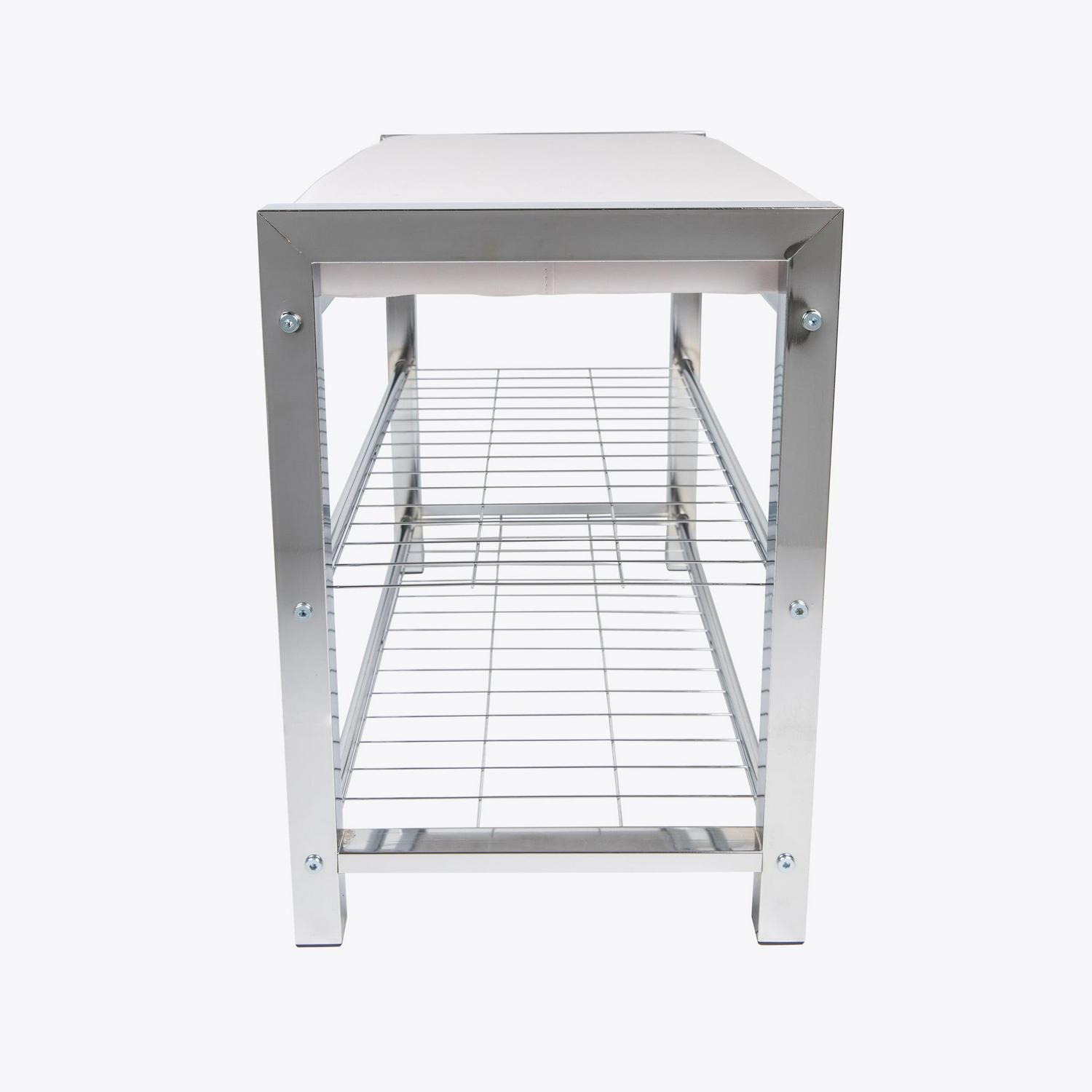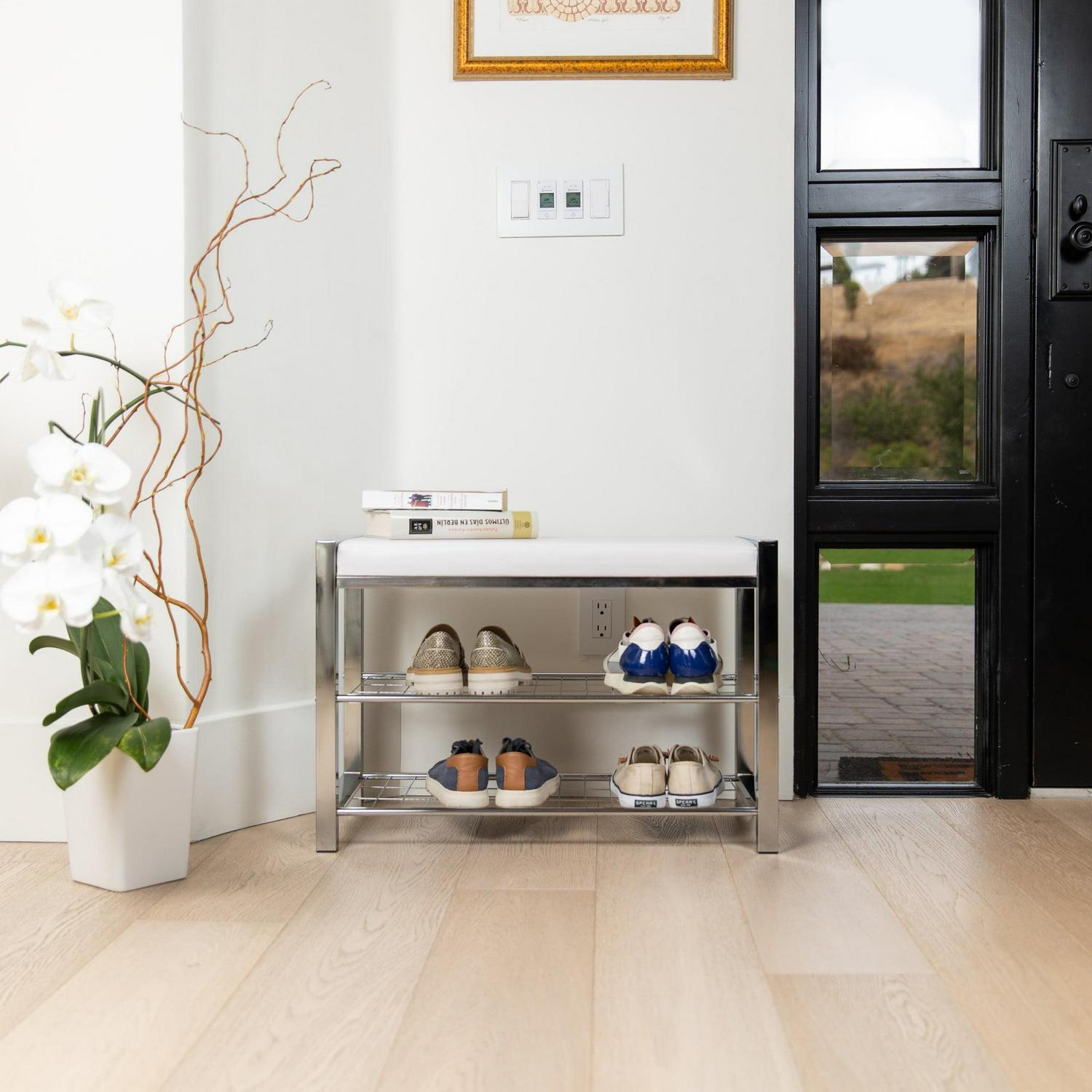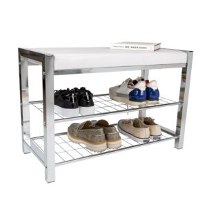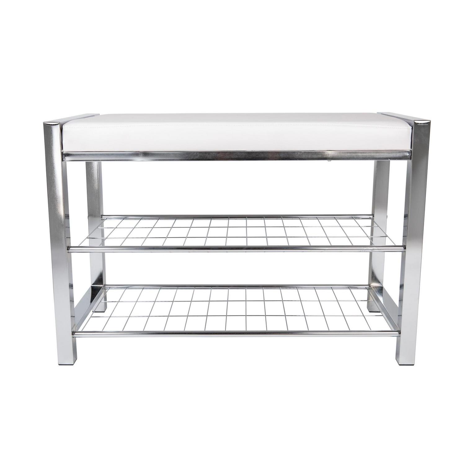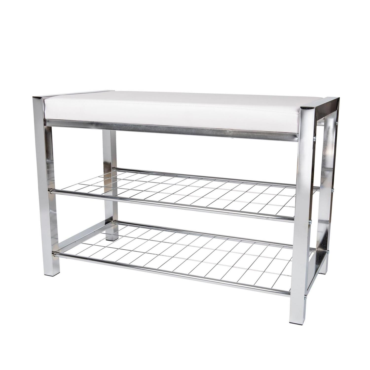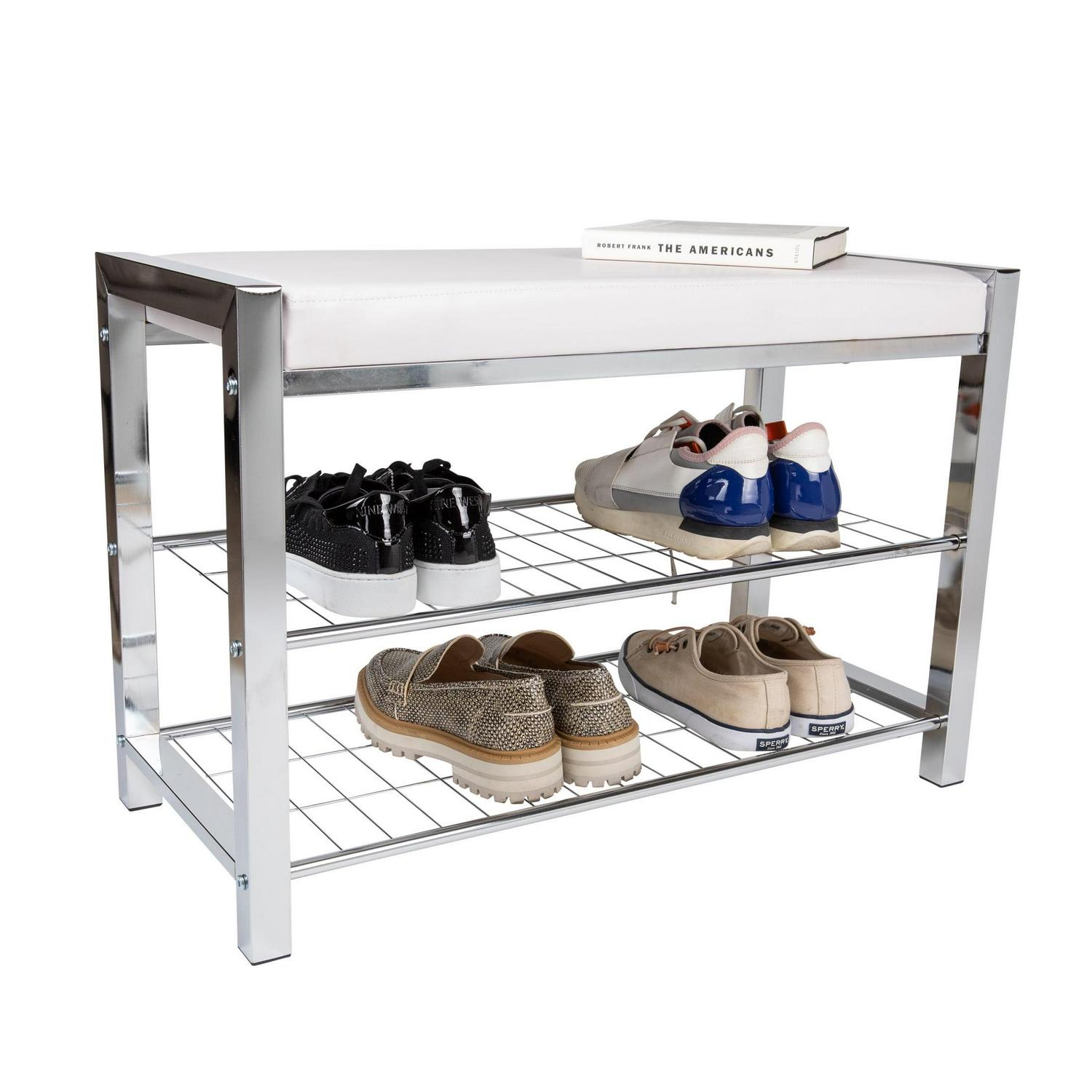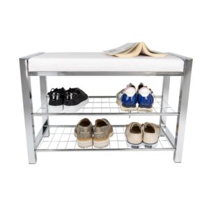 – Decorative, contemporary, 2-tier shoe storage bench offers superior functionality and beauty with its leather-upholstered top and elegant metal frame