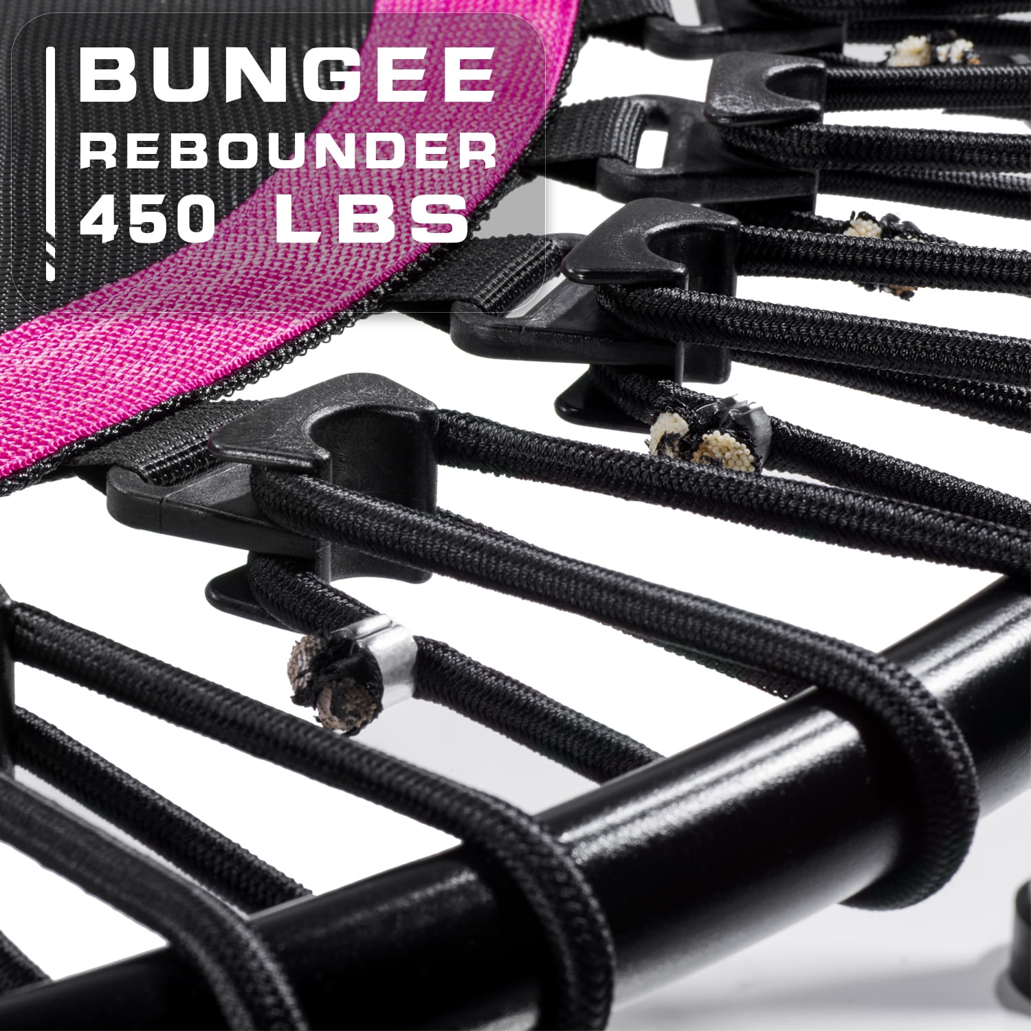 Why Choosing Bungee Cords Instead of Springsï¼ 1.LONGER Lifespan 2.SAFER than spring trampoline 3.Rebound HIGHER than spring trampoline 4.KNEES PROTECTION due to soft rebounding 5.Silence Jumping ( like people talking in 15 fts away)