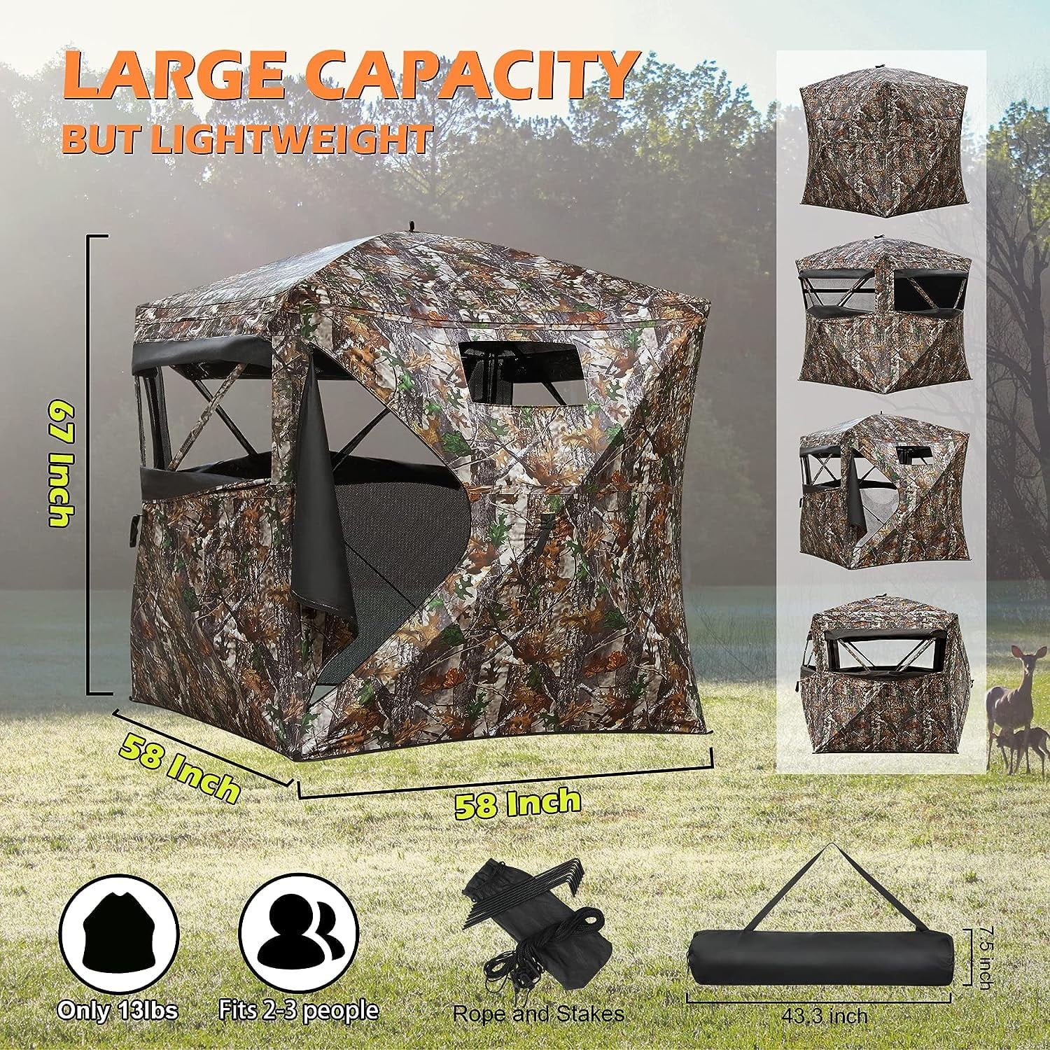 - Large capacity – 58″ L X 58″ W X 67″ H which can include 2-3 persons. You and your hunting partner won’t feel constrained in the tent. And access to your hunting equipment freely. With a carry bag, rope, and stakes. It’s large but fairly lightweight at only 13 lbs. You can carry this deer blind like a backpack to the woods