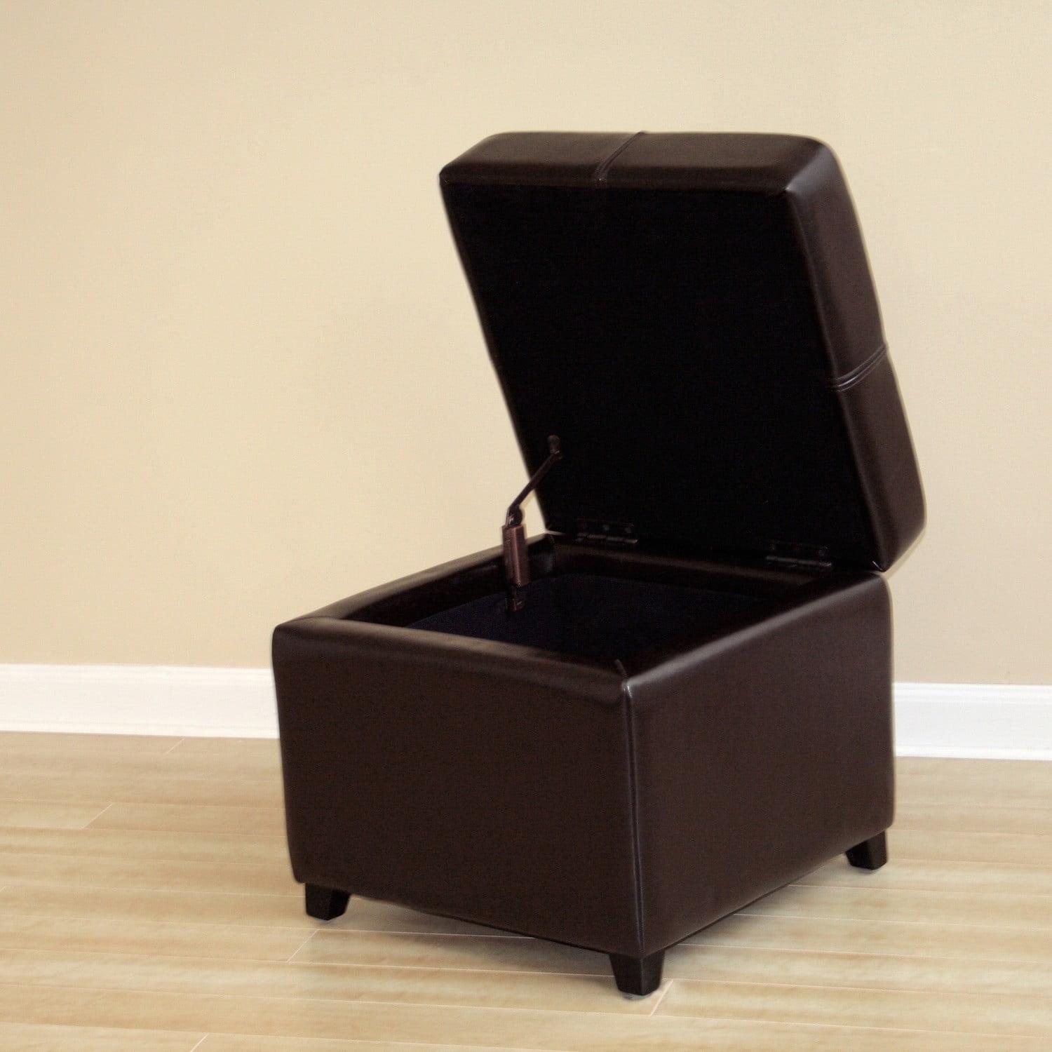 Dark Brown Full Leather Storage Cube Ottoman This small cube ottoman is the ultimate in versatility. The top consists of four leather panels, which are securely stitched together, forming a simple square pattern. Lift the lid to reveal ample space in which to store frequently used items, such as favorite books, remote controls, blankets, and more. Little hands and fingers will be protected by the additional safety hinge.