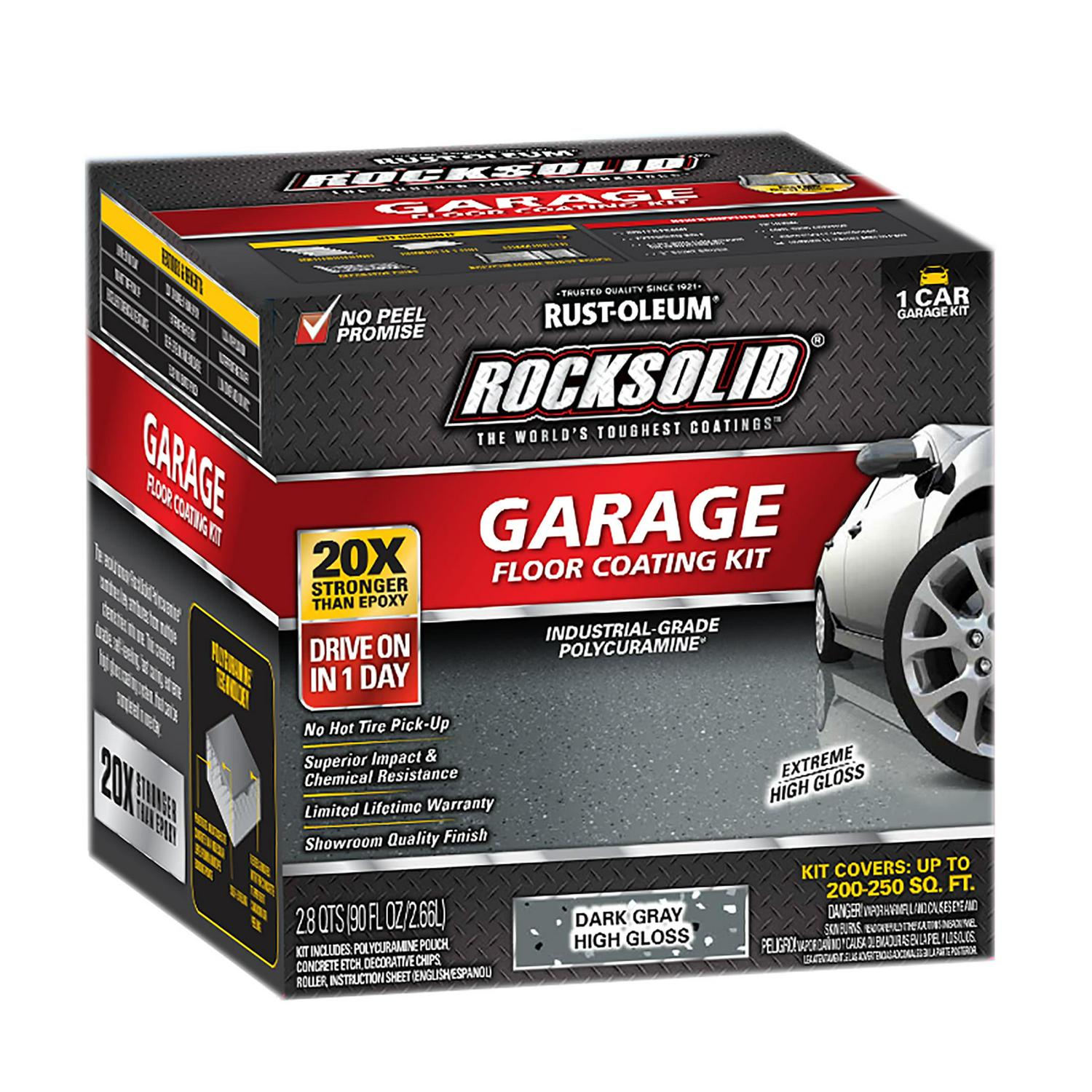Dark Gray, RockSolid Dark Gray Polycuramine Garage Floor Coating Kit-317286, 76 oz: Comes with everything needed to give garage and concrete floors a high-gloss, ultra-durable finish that is up to 20 times stronger than epoxy coatings. Unique formula contains up to 96% solids for amazing durability and chemical resistance while remaining low odor and low VOC. Concrete coating is self-leveling and buildable and can be driven on in as little as 24 hours.