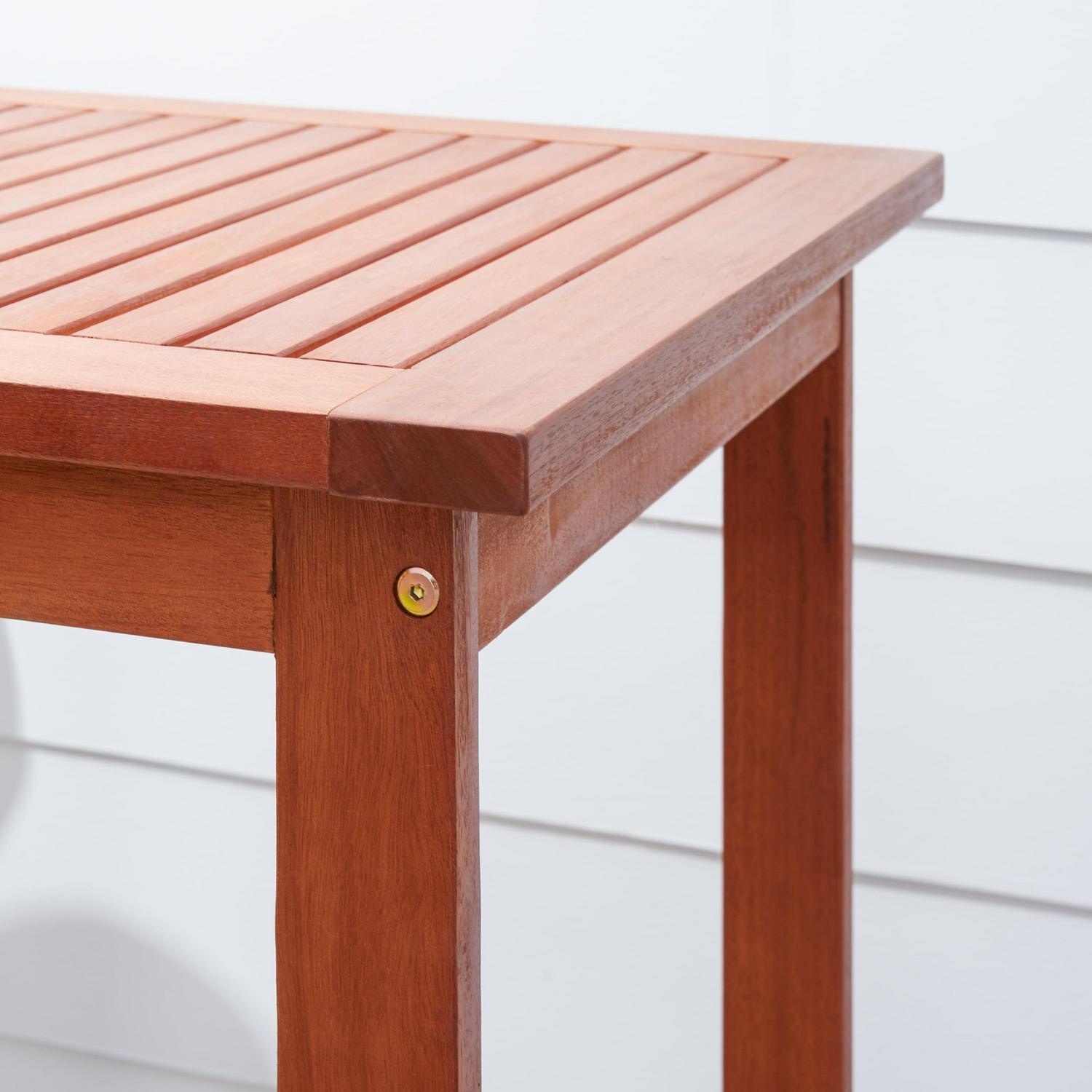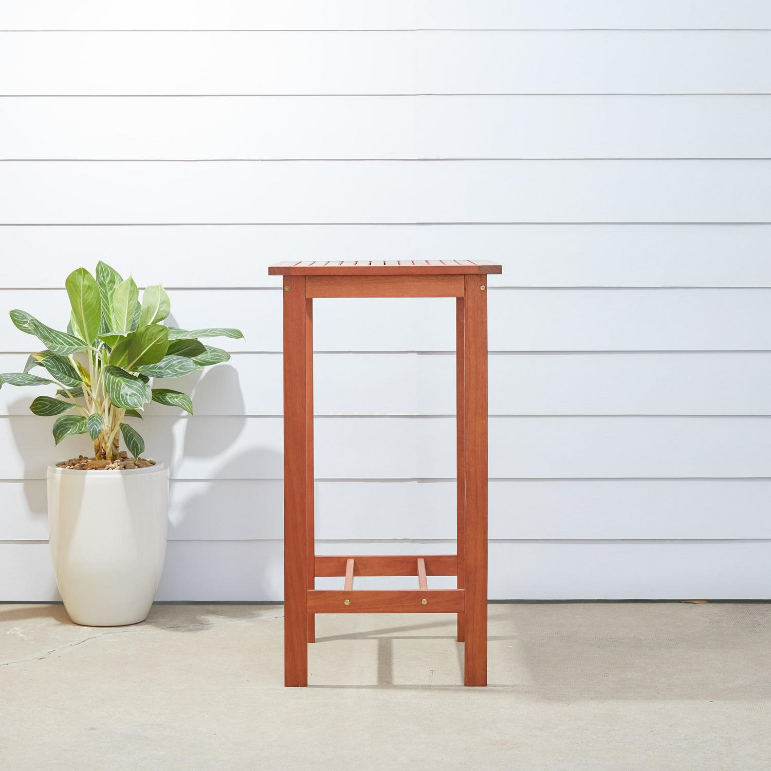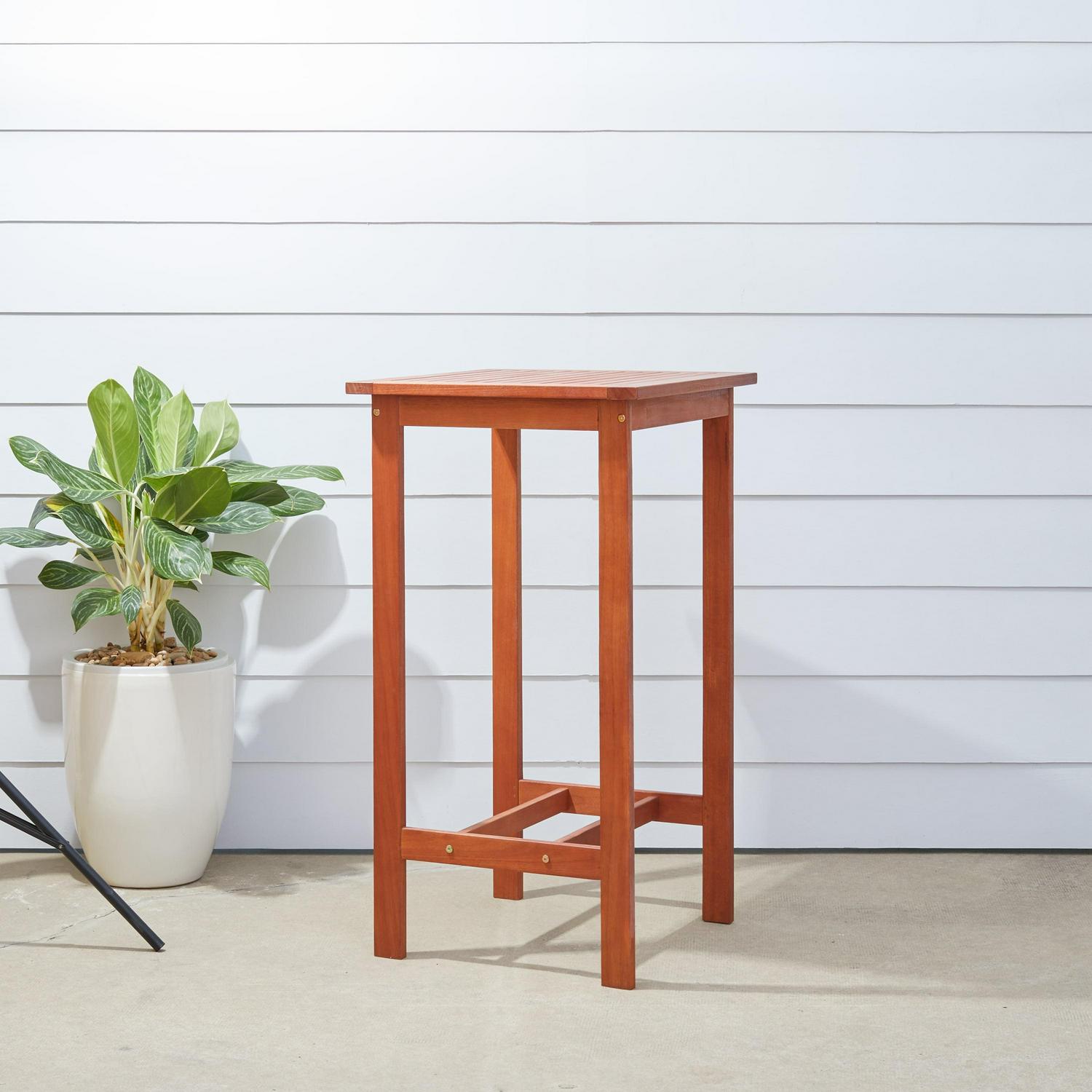 The perfect table to stand between your Patio Bar Chairs, our Malibu Outdoor Patio Wood Bar Table will offer a convenient place for your drinks, snacks or a casual meal outdoors. Made from solid Eucalyptus wood, this table can stand up to all kinds of changes in the weather. Comes in the beautiful Natural Wood Finish, this will be a great addition to your outdoor patio!