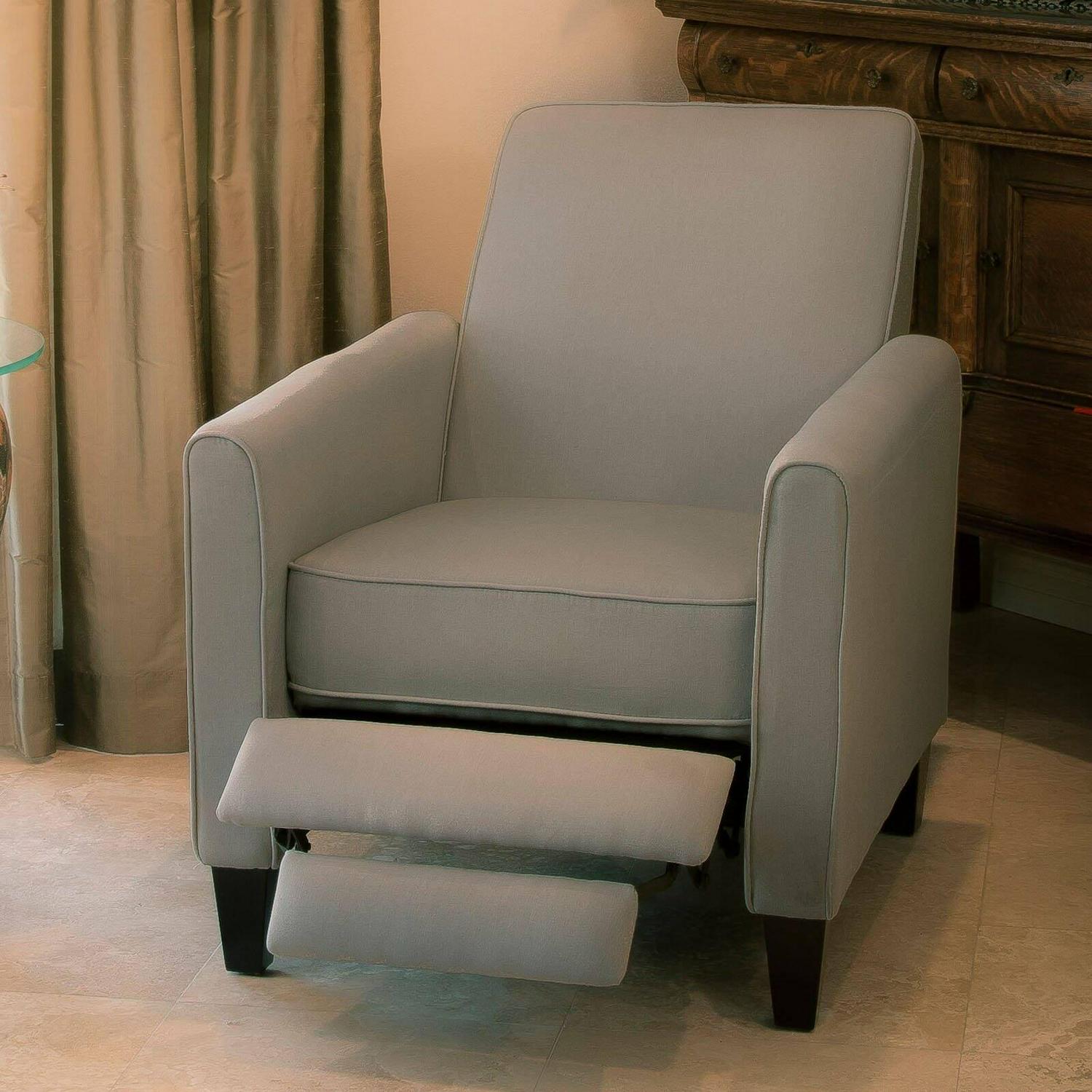 Compact in size and big on comfort, the Darvis Push Back Recliner makes any cozy little space even cozier. With a wood frame, it features solid fabric upholstery that s neither too light nor too dark. Sit back, and the foot extension and reclining back will have you napping, reading a book, or watching TV in no time.