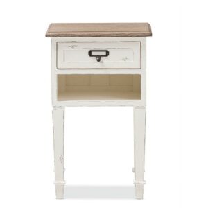 Dauphine Provincial Style Weathered Oak and White Wash Distressed Finish Wood Nightstand Boasting a white-streaked and distressed finish plus plenty of storage space via drawer and shelf, our Dauphine Provincial Style Nightstand unifies fashion and functionality. The genuine mindi-wood top features a white-streaked natural veneer that pairs perfectly with the distressed white finishing that comprises the remainder of this bedside table. Black metal drawer handle offers attractive contrast. Superb value in a discount-furniture item. Made in Indonesia, the accent table requires assembly.