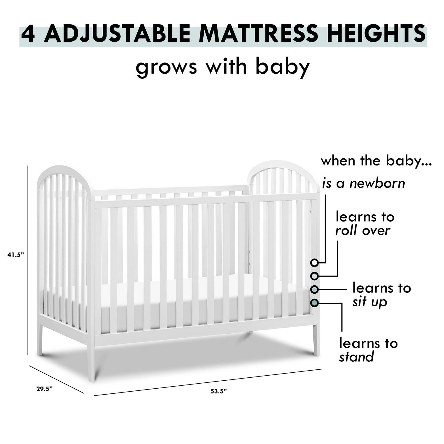 – GROWS WITH BABY: 4 adjustable mattress positions that you can lower as your baby begins to sit and stand. We’ve built this crib to withstand even the most active babies and toddlers and last through your child’s teen years