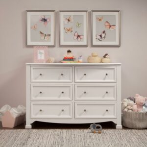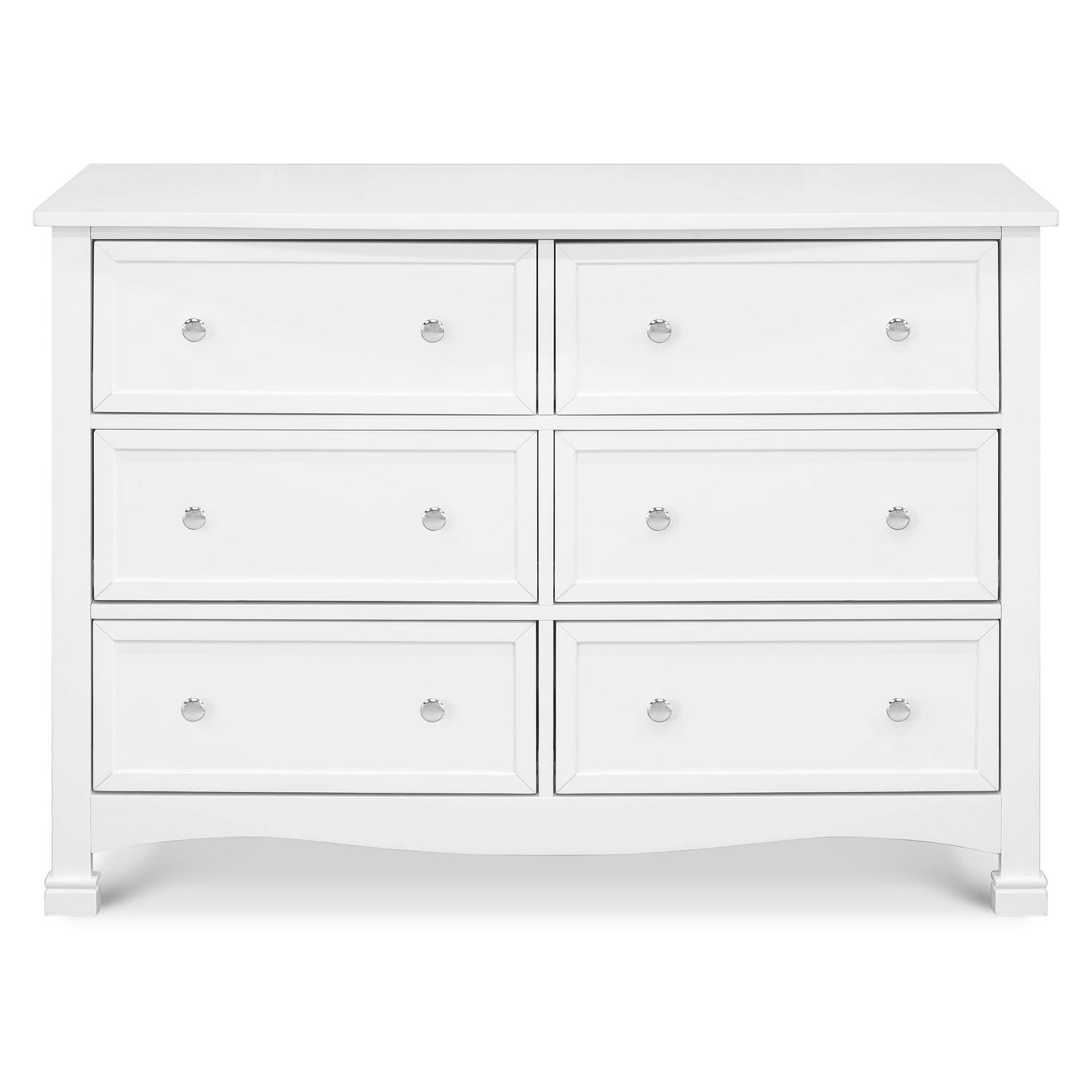 The Kalani 6-Drawer Dresser is the smart changing and storage solution for the classic Kalani, Emily and Fiona nursery collections. Six spacious drawers provide ample storage to organize all of baby s necessities, while its thoughtful design ensures a style fit for any nursery or bedroom. The Kalani Double Dresser is detailed with recessed front drawer panels, a gently curved apron front and curved top sides.