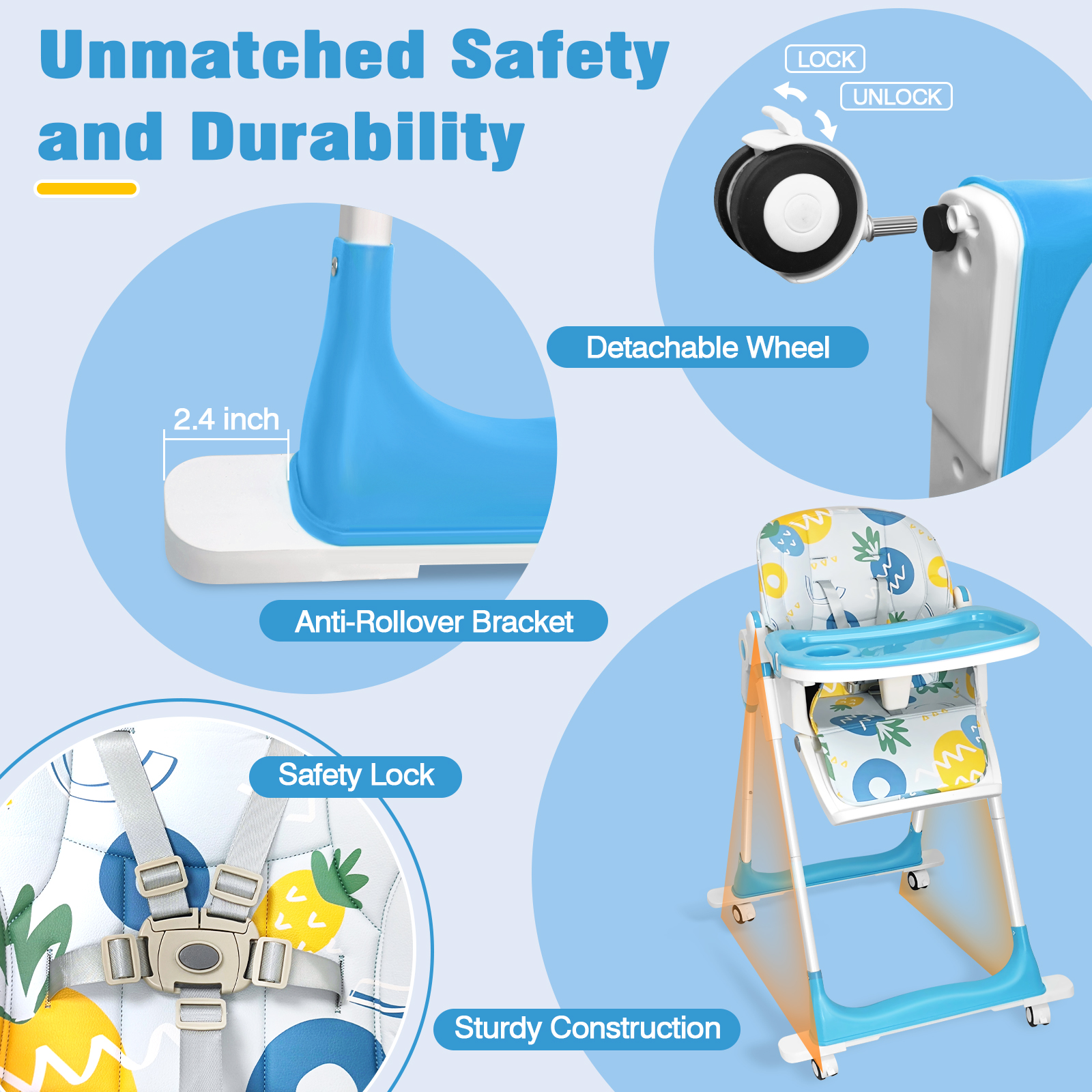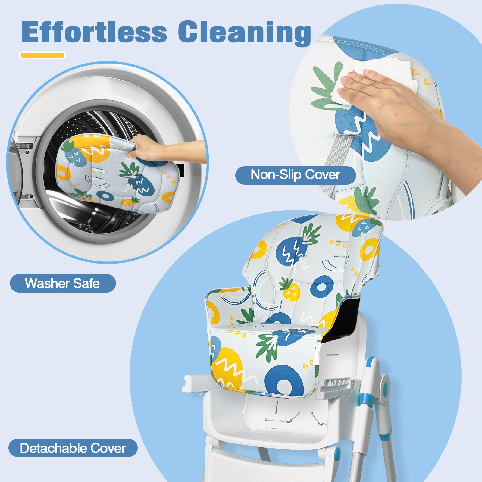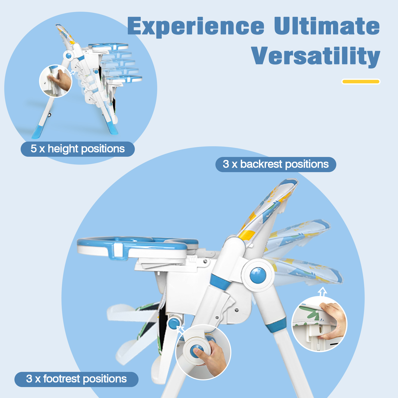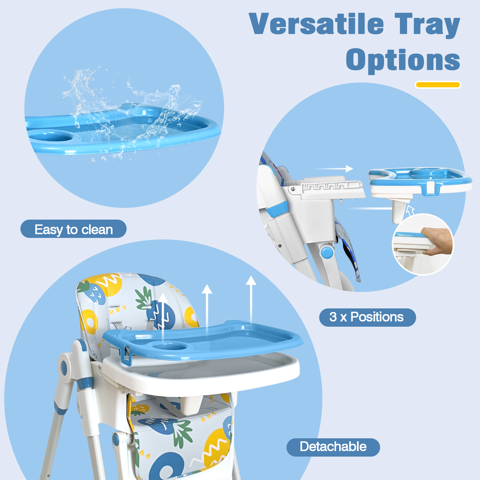 Adjustable height high chair: it can meet the different purposes of eating, playing, feeding, resting and interacting with parents. The 5-position height adjustment allows you to find the most comfortable feeding height for your baby. Adjustable Backrest:The Angle of the backrest can be adjusted in the third gear, so that your baby can enjoy the ultimate comfort whether it is eating or resting. Washable Tray:The distance between the double tray and the backrest can be adjusted according to the age of the child. The top layer of the double tray can be removed and washed in the dishwasher. When not in use, the entire tray can be folded for easy storage. Foldable Design:The folding design of the high chair is specially designed for the home with small space.The bottom of the baby high chair has an anti-rollover design, which can prevent the high chair from rollover and ensure the safety of the baby.Waterproof PVC fabric, water stain is not easy to penetrate. In addition, the 5-point seat belt effectively prevents the baby from falling.