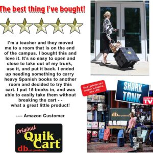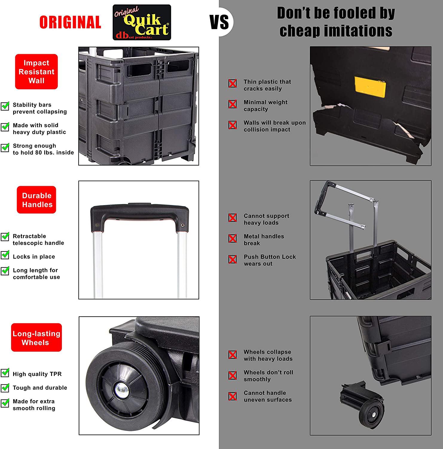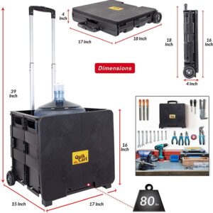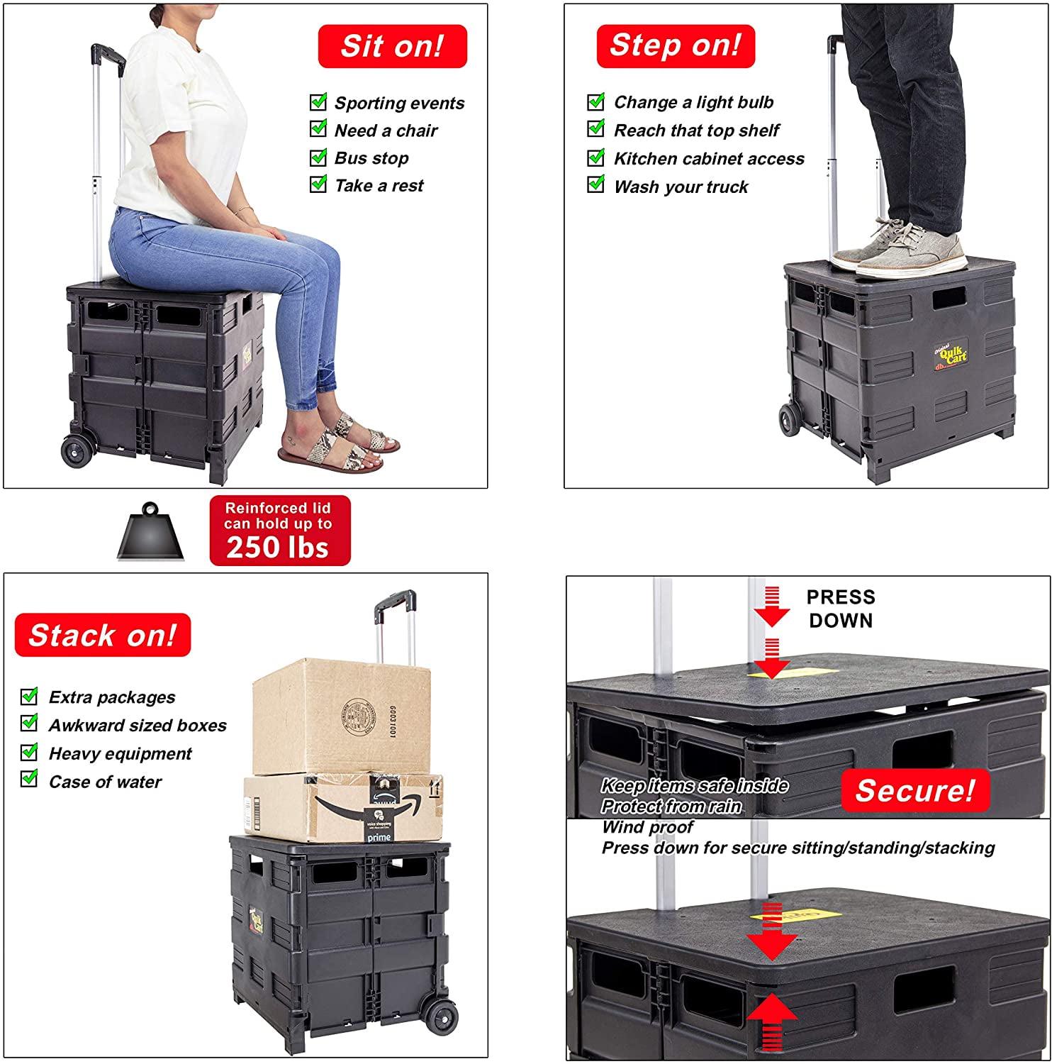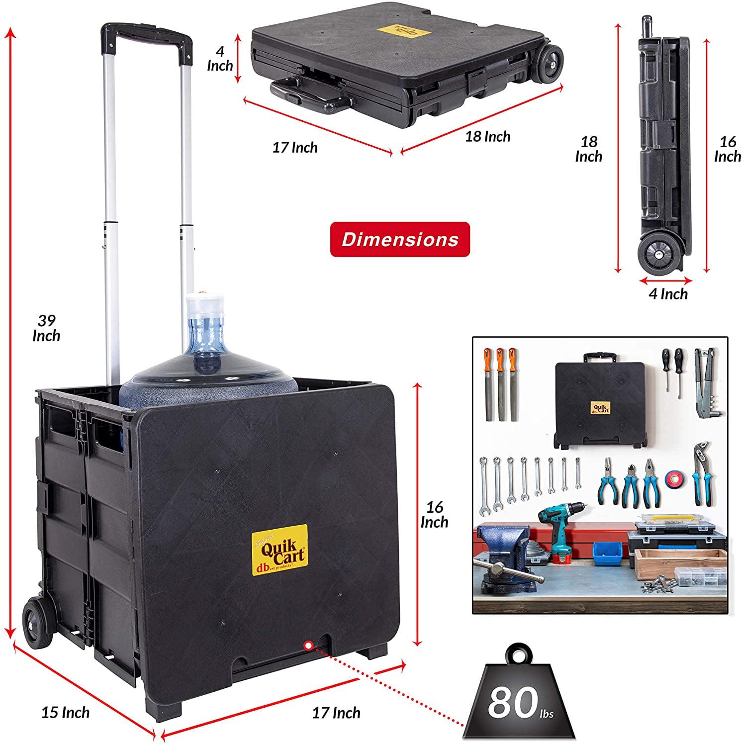 Original Quick Cart. Use it, abuse it, store it! This can be used for transporting, shopping, traveling, portable storage, and seating and as a stepping stool. This can be abused by hauling up to 80 pounds, has a durable heavy duty plastic seat. It can be stored by collapsing down to 3 inches thick, is rust proof, and weighs less than 8 pounds. This package contains one box trolley with the dimension 18x18x3 inch. This rolling bin facilitates the transport of groceries for seniors like no other utility carrier because of its ergonomic retractable handle. Keep your document organized on this wheeled utility organizer. Use this rolling cart (folding cart) as a rolling tool box, rolling cart for teachers, laundry basket with wheels, rolling files carts with wheels or file crate.