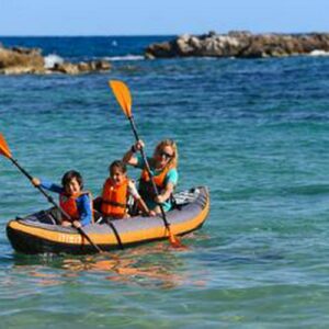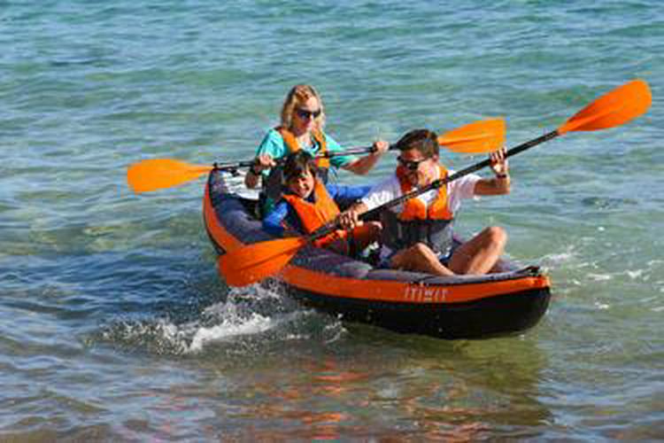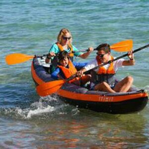 Kayaks are a great way to get into the water and have peace of mind we made sure that you feel energized to go into the water. Our Decathlon Itiwit Inflatable Recreational Sit on Kayak with Pump, 2 or 3 Person is perfect for transportation and durability in the water! Our team of kayakers has developed this inflatable touring kayak for beginners on half-day trips. The 3 Person Inflatable Kayak can hold a maximum weight of 505 lbs. Inflates in 10-12 Minutes and deflates in 5 Minutes. Easy transportation due to 2 Shoulder straps, one hand strap, and weighing in at 37.5lbs. Double layer rip stop structure to increase durability and prevent punctures.