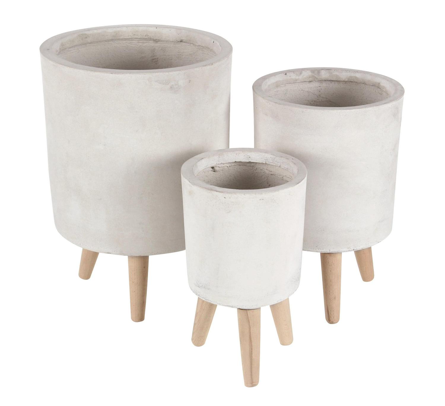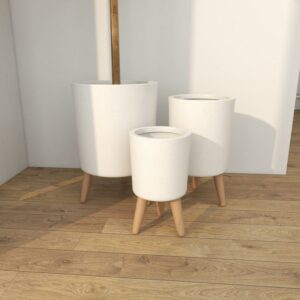 – Our decorative planters showcase 3 cylinder-shaped fiber clay pots in varying sizes designed with deep settings and short wooden legs