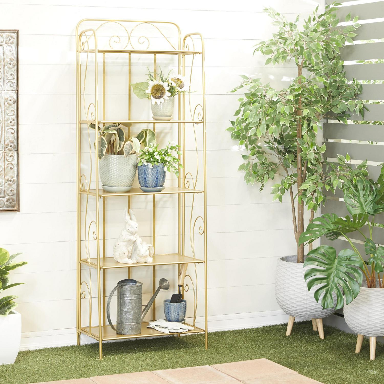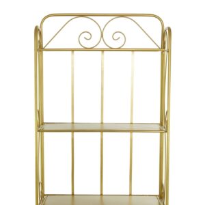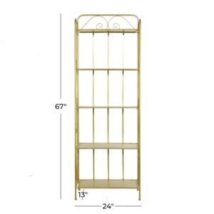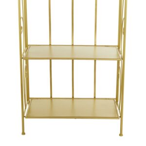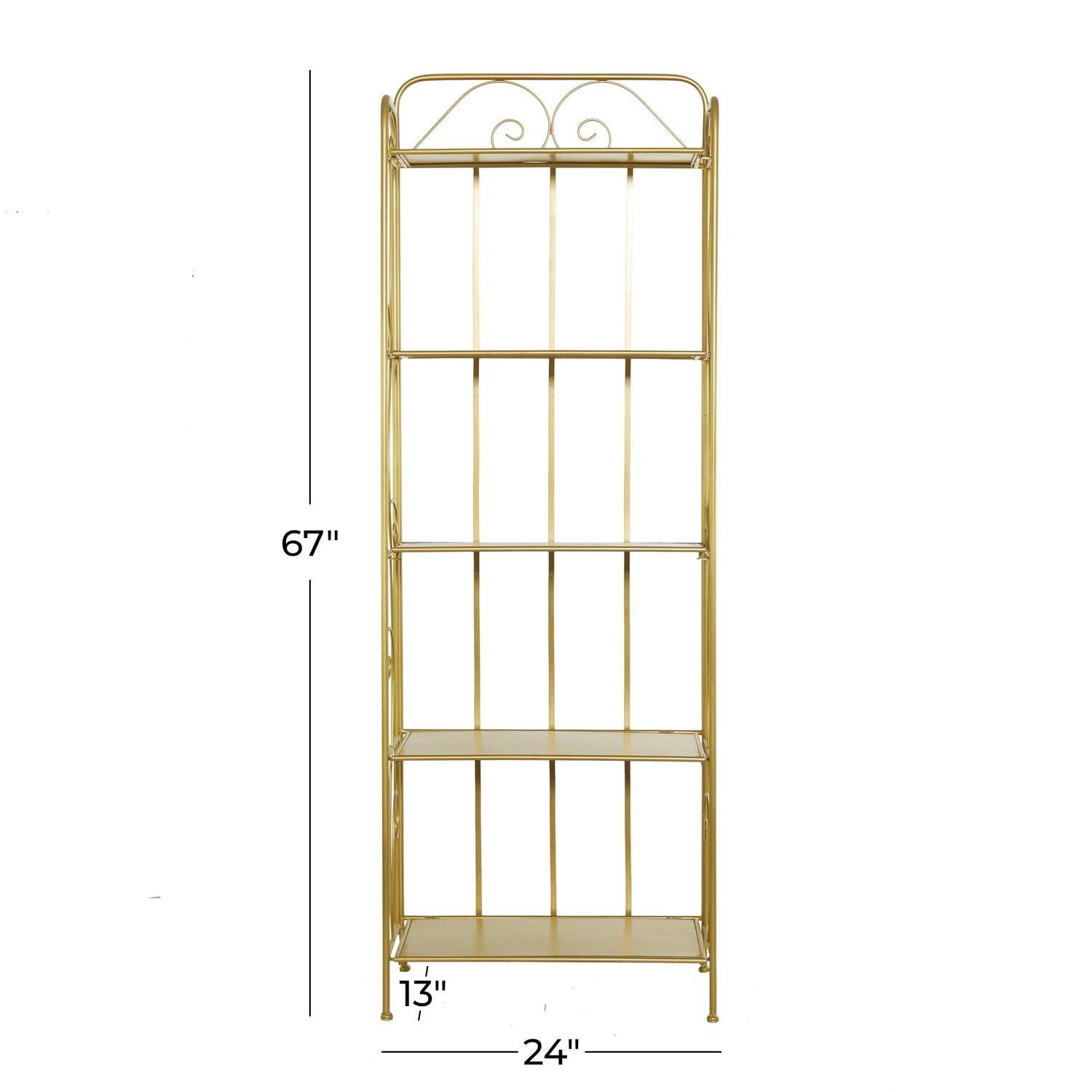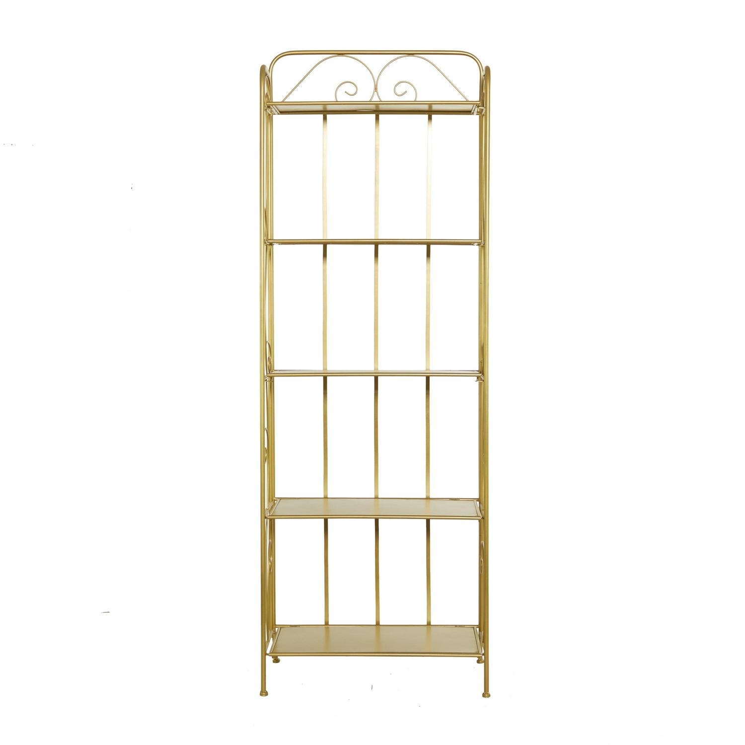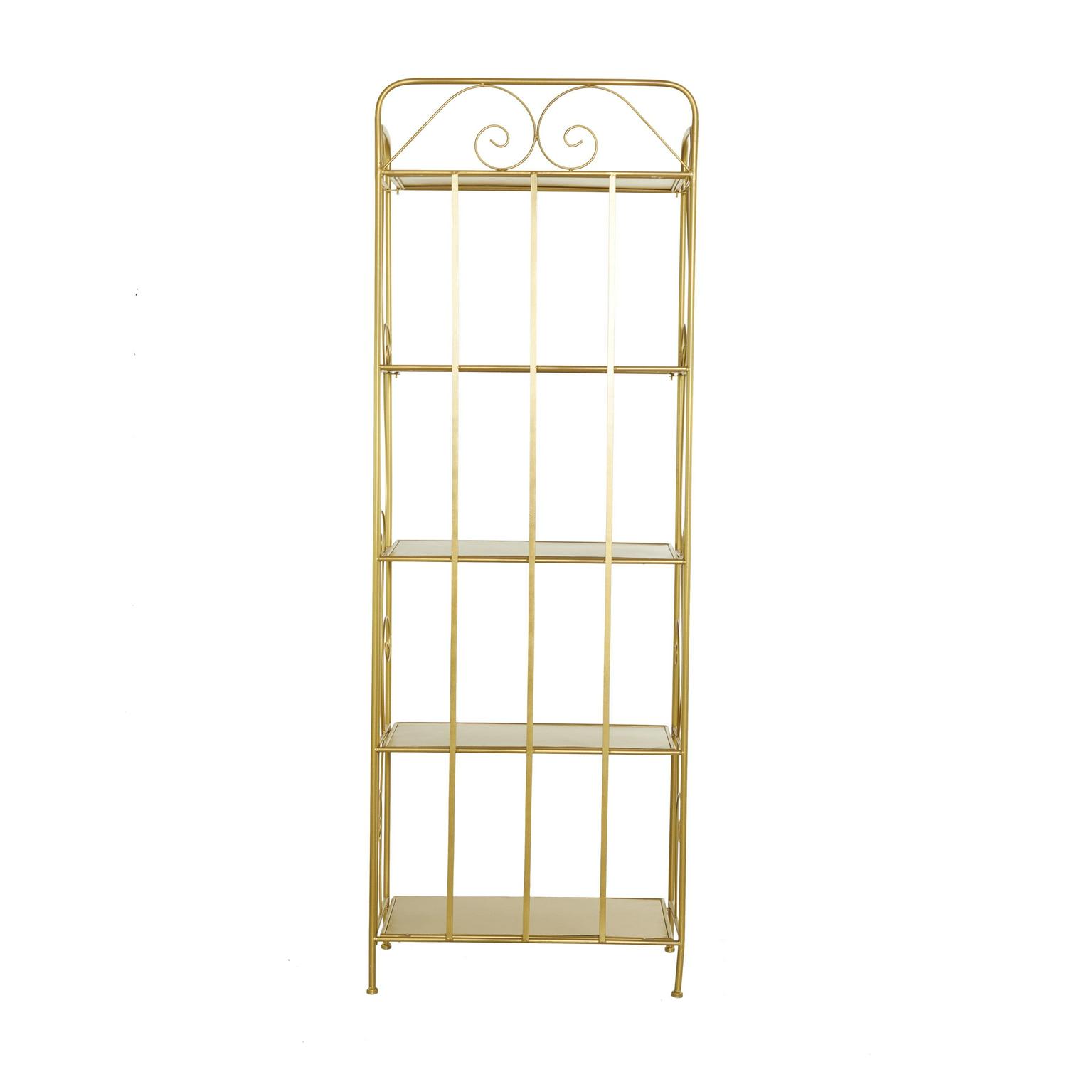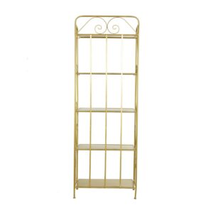 DecMode 13″W, 67″H Metal Glam Bakers Rack, Gold, 1-Piece is a unique addition to your stylish home. A storage piece that is spacious to keep your valuable organized and safe. Appreciate their design best against solid-colored backgrounds. This romantic gold bakers rack is versatile for both indoor and outdoor display and can be used for showcasing your potted plants, decorative boxes, candles, sculptures, and books. Designed with felt or rubber stoppers at the base that prevent scratching furniture and table tops, as well as sliding around. This item ships in 1 carton. Suitable for indoor and outdoor use. This item ships fully assembled in one piece. Avoid using abrasive cleaning pads or detergents, use a sponge with mild soap and warm water, then rinse with a garden hose.. This bakers rack features a 5 tier metal shelving unit. Glam style. This bakers rack is made from solid iron construction with protective coating making it impervious to the elements with anti-corrosive property.