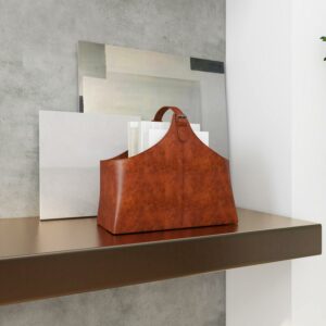 – This leather magazine holder carries a smooth reddish brown exterior and inner lining