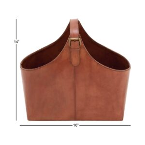 DecMode 14″ Brown Leather Handmade Box Style Single Slot Magazine Holder with Detail Stitching and Curved Handles is a unique addition to your stylish home. The perfect compact storage for your belongings while keeping your space free of clutter. Bring a finishing touch to your home with an inviting appeal with this chic magazine holder. This leather magazine organizer can serve as a reading material holder or as decorative container next to sofa sets in the living room. This item ships in 1 carton. Leather magazine holder makes a great gift for any occasion. Due to the handmade nature of this item, no two will be alike, there will be slight differences in shape, size, and color. Suitable for indoor use only. This item ships fully assembled in one piece. Leather and hair on hide are natural products, and therefore no two will be alike. There may slight variations in pattern, natural blemishes, colors, and overall aesthetic of the product. Maximum weight limit is 15 lbs. Made in India. This is a single brown colored magazine rack. Modern style.