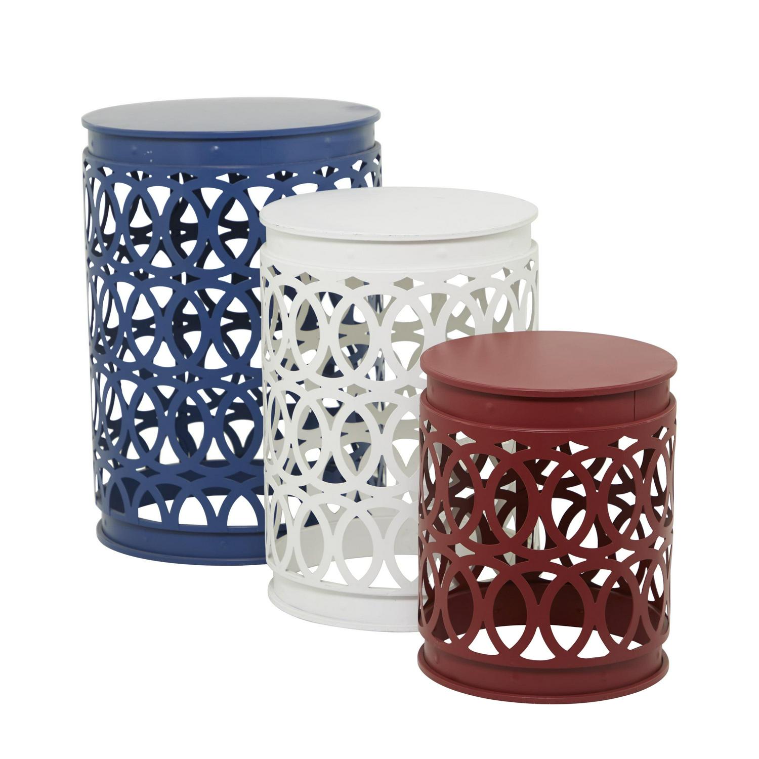 DecMode 16″ x 23″ Multi Colored Metal Indoor Outdoor Nesting Accent Table with Carved Trellis Design, 3-Pieces is a unique addition to your stylish home. A compact friendly table providing you with additional storage space any where in your home. Place this item next to your patio seating, near the pool, garden or challenge your creativity by brining it inside for individualistic appeal. Add vibrant color and form to your outdoor setting with this trio of accent tables, and place small succulents or plants on top for a playful look. This item ships in 1 carton. Suitable for indoor and outdoor use. This item ships fully assembled in one piece. Maximum weight limit is 100 lbs. This multi colored end table comes as a set of 3. Contemporary style.