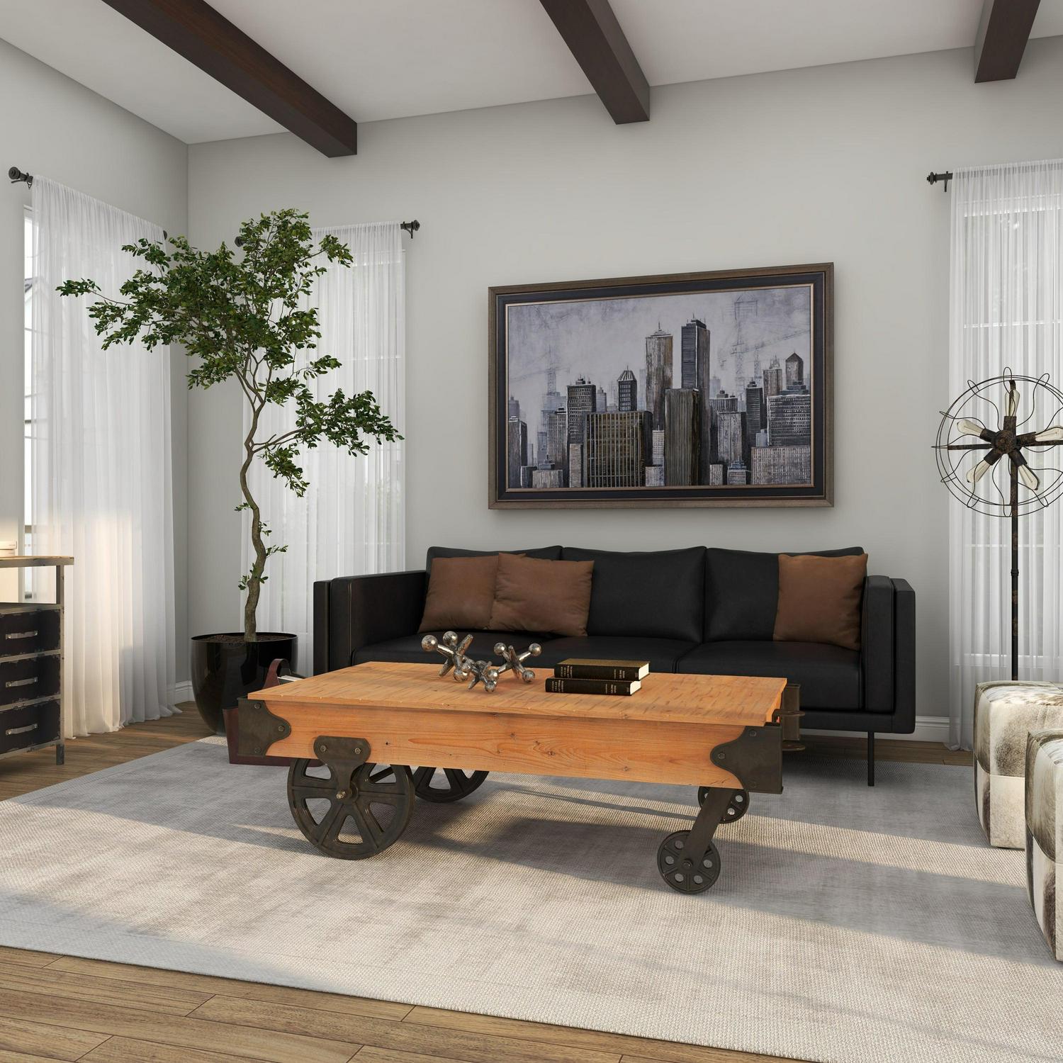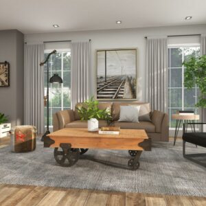 - DecMode 17″ x 56″ Brown Wood Industrial Coffee Table makes a perfect addition to any home