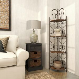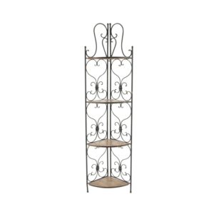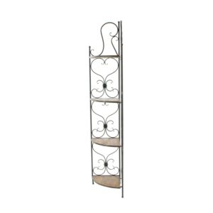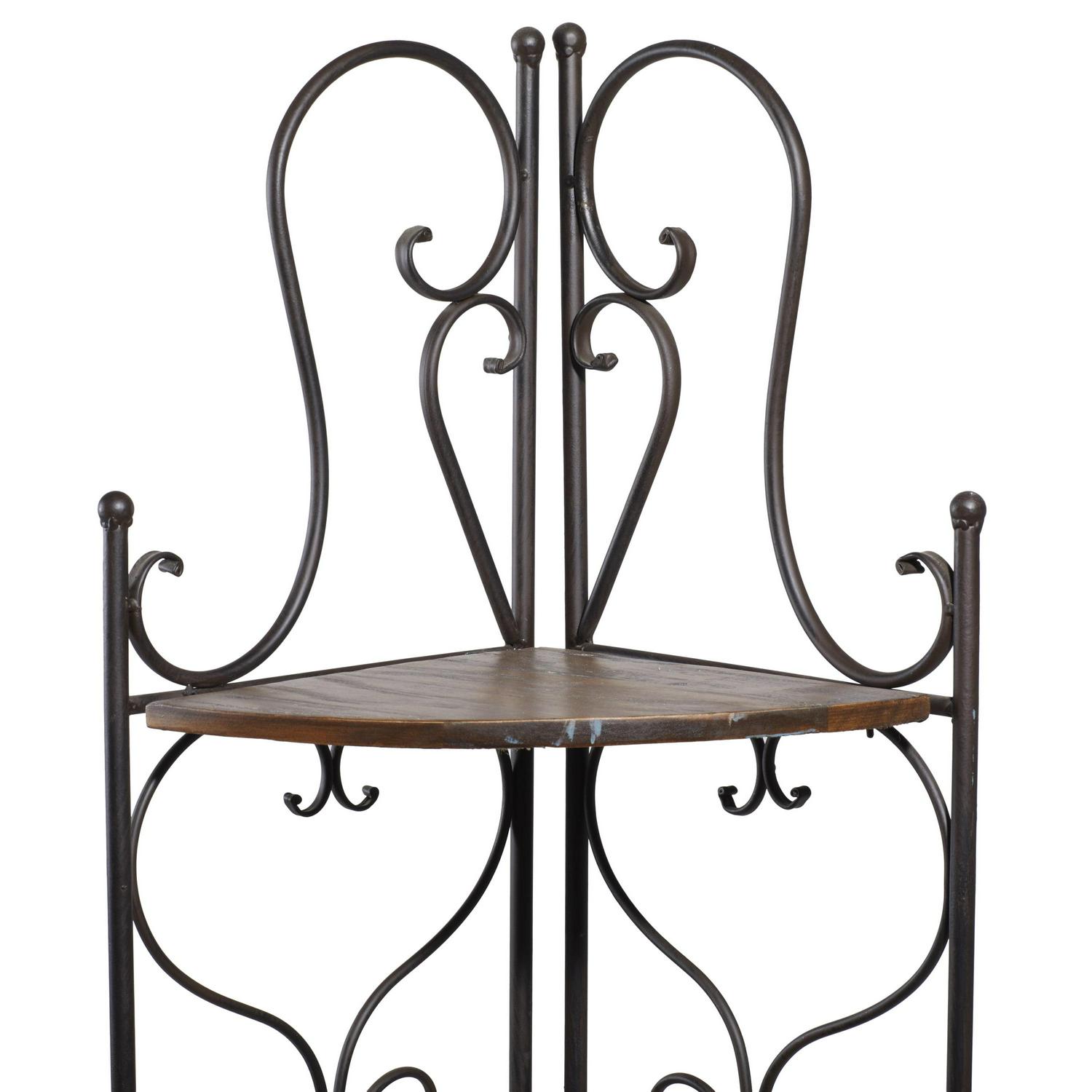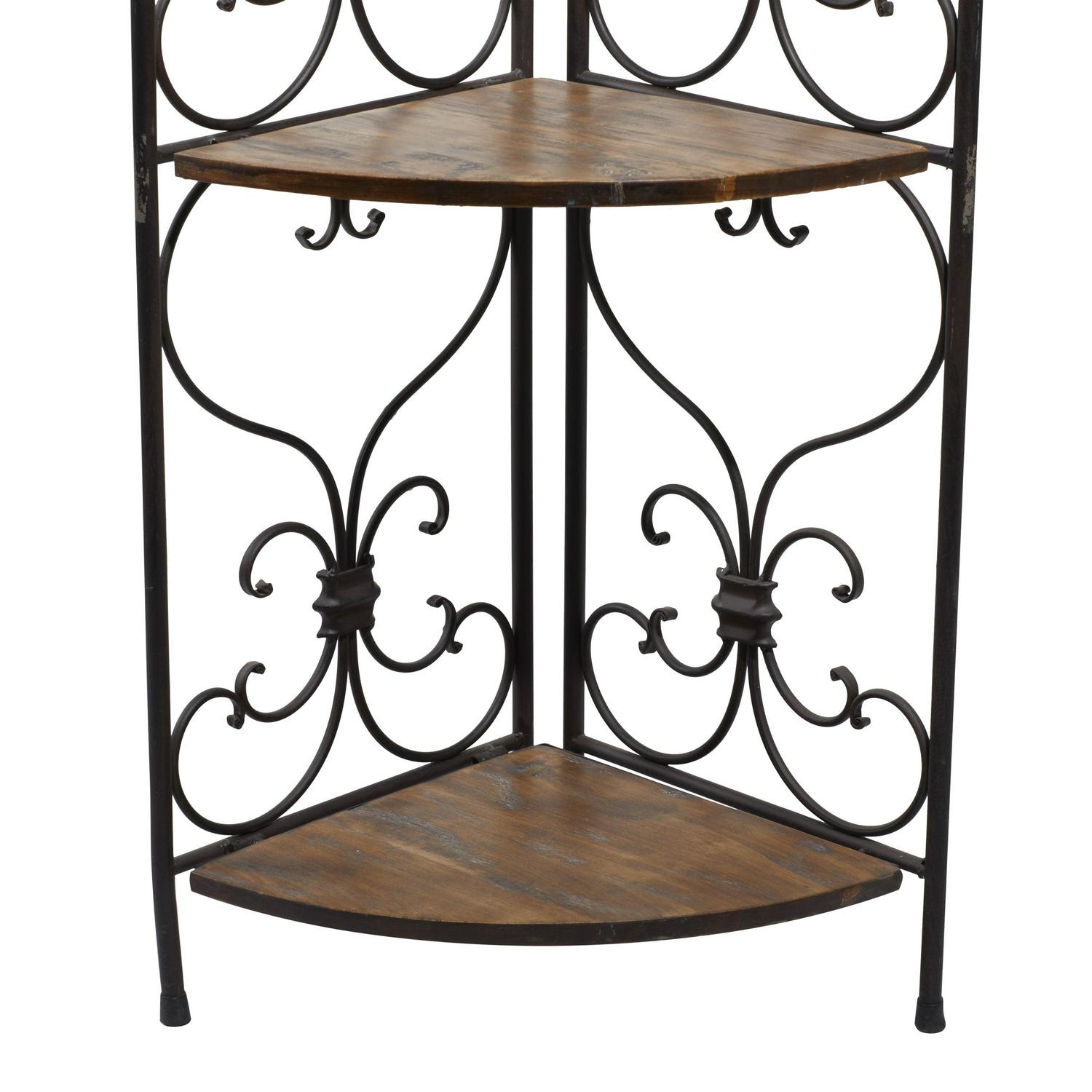– Tall corner rack features four solid wedge wooden shelves with scrollwork metal structure providing a secure and protective display of all your belongings