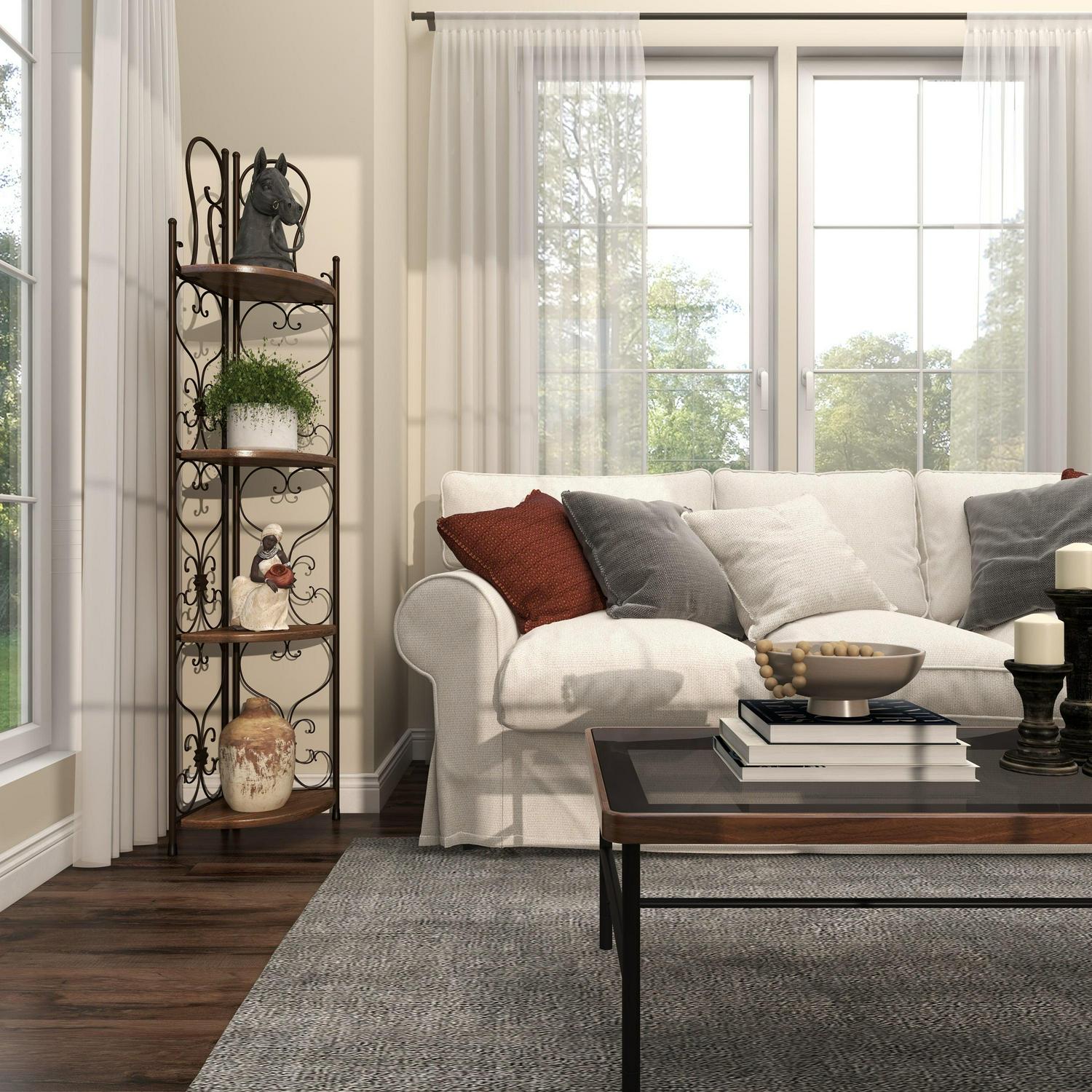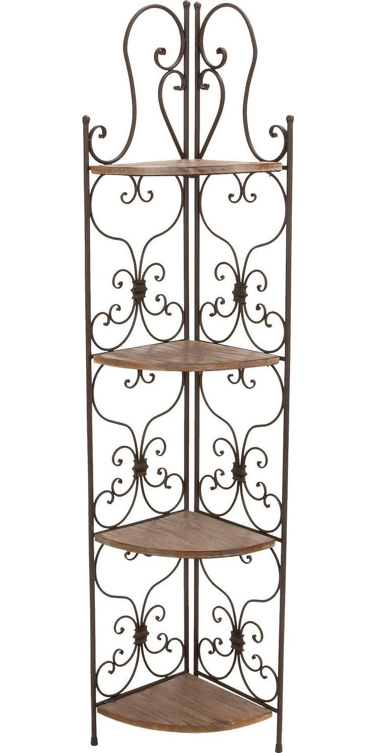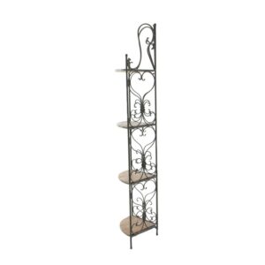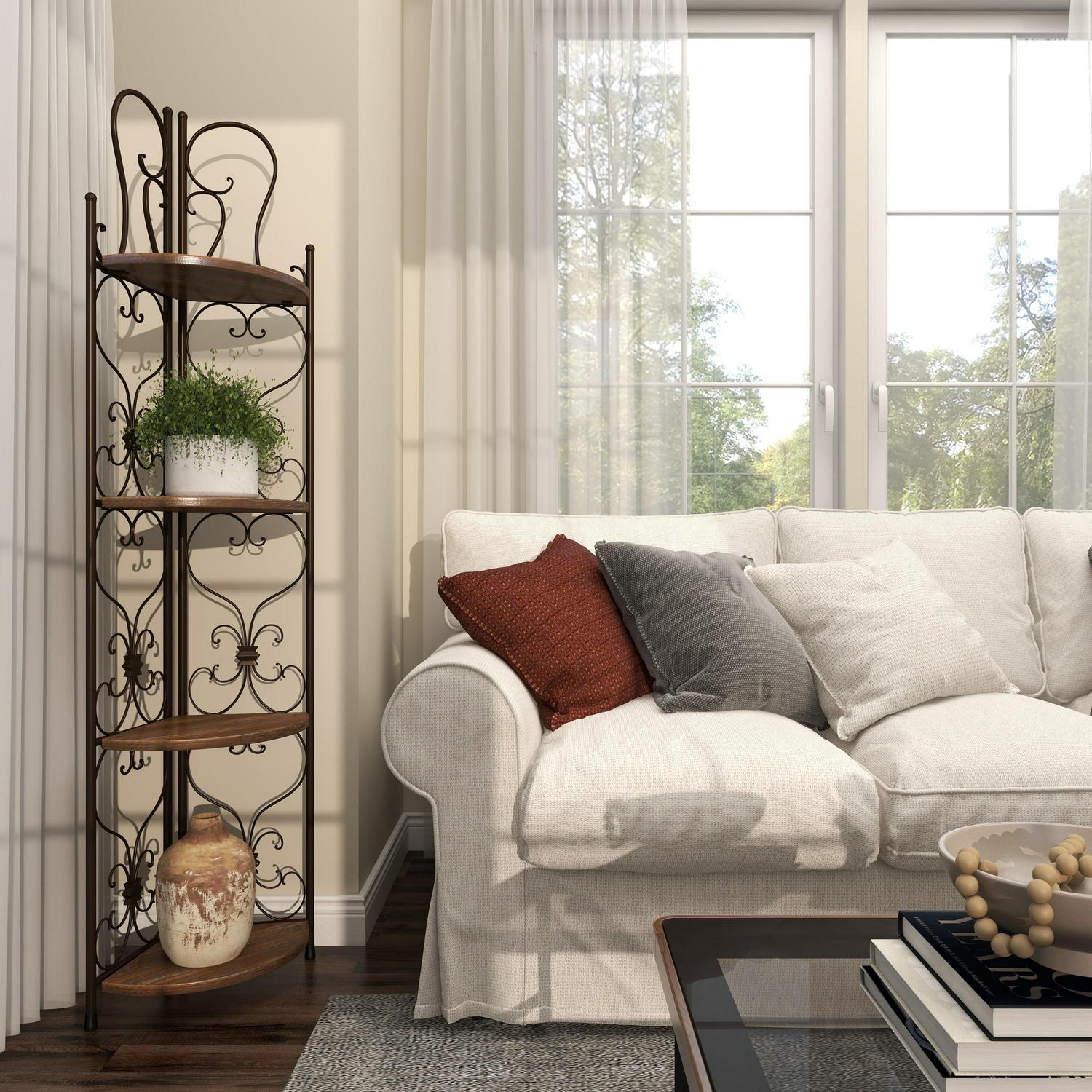 – Tall corner rack features four solid wedge wooden shelves with scrollwork metal structure providing a secure and protective display of all your belongings