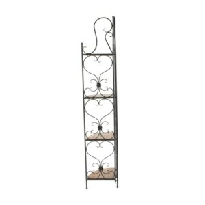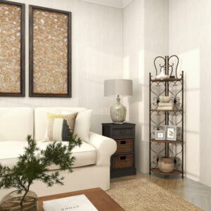 DecMode 18″ x 66″ Brown Metal Scroll Tall Folding 2 Drawers and 4 Shelves Bakers Rack, 1-Piece is a unique addition to your stylish home. A storage piece that is spacious to keep your valuable organized and safe. Appreciate their design best against solid-colored backgrounds. Display this shelving rack in any space for a clutter free zone and filled with bright-colored potted cacti, books, sculpture or flowers. Designed with felt or rubber stoppers at the base that prevent scratching furniture and table tops, as well as sliding around. This item ships in 1 carton. Three metal feet provide stability. Suitable for indoor use only. This item ships fully assembled in one piece. Maximum weight limit is 30 lbs. This is a single brown colored display shelf. Iron bakers rack features 4 shelves. Farmhouse style.