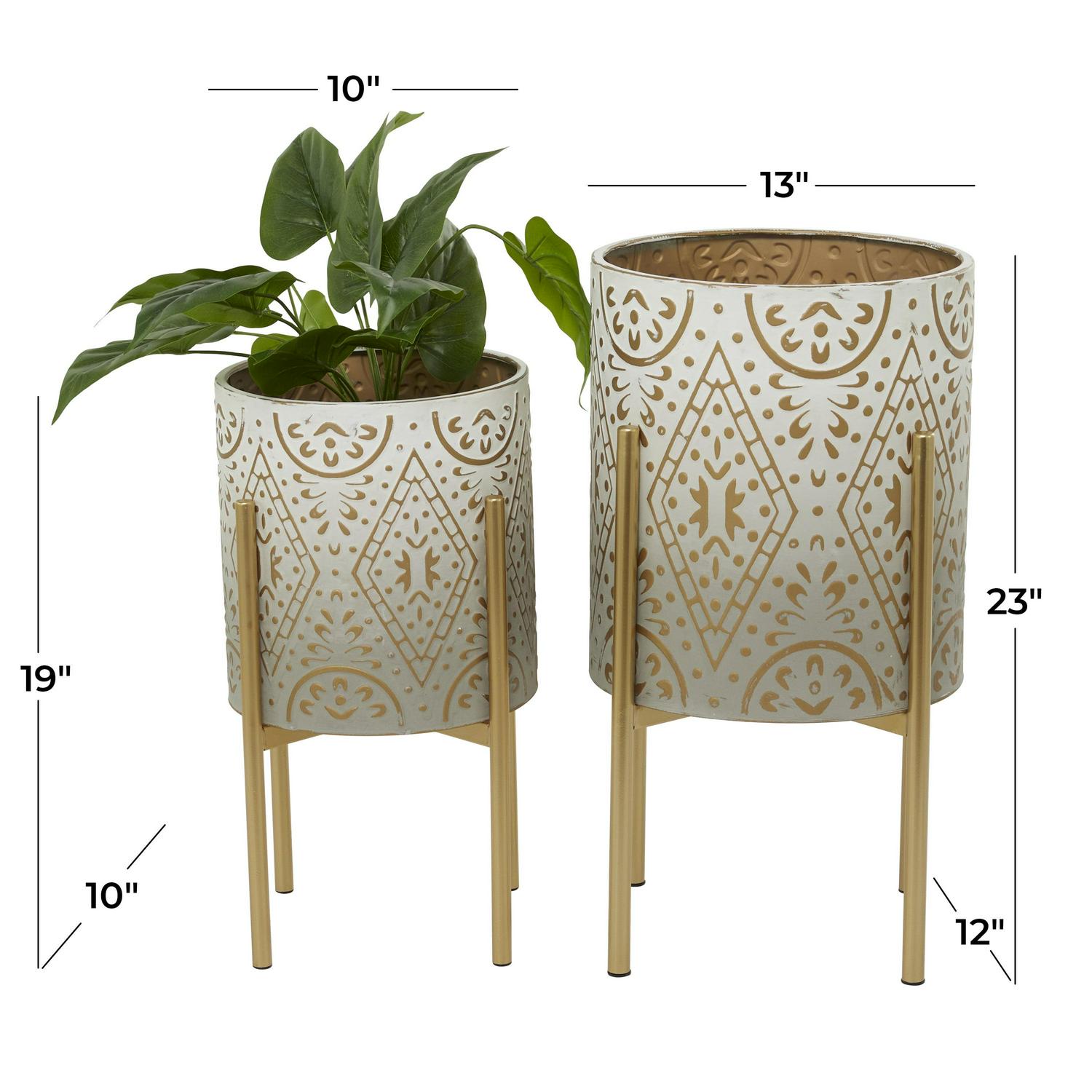 DecMode 23″, 19″H Indoor Outdoor Cream Metal Planter with Removable Stand (2 Count) is a unique addition to your stylish home. These planters features a deep pot with slender structure making a friendly planter for any compact space. Enhance the mood and the look of your room with some plants in these beautifully designed planter. Bring nature into your space with this bohemian planter set that provides a fresh and unique look to the interior or exterior of your home. This item ships in 1 carton. Please note that this item is for decorative use only. Suitable for indoor and outdoor use. This item ships fully assembled in one piece. Maximum weight limit is 20 lbs. Planters do not have drainage holes but they are not watertight. This cream colored plant pot comes as a set of 2. Bohemian style.