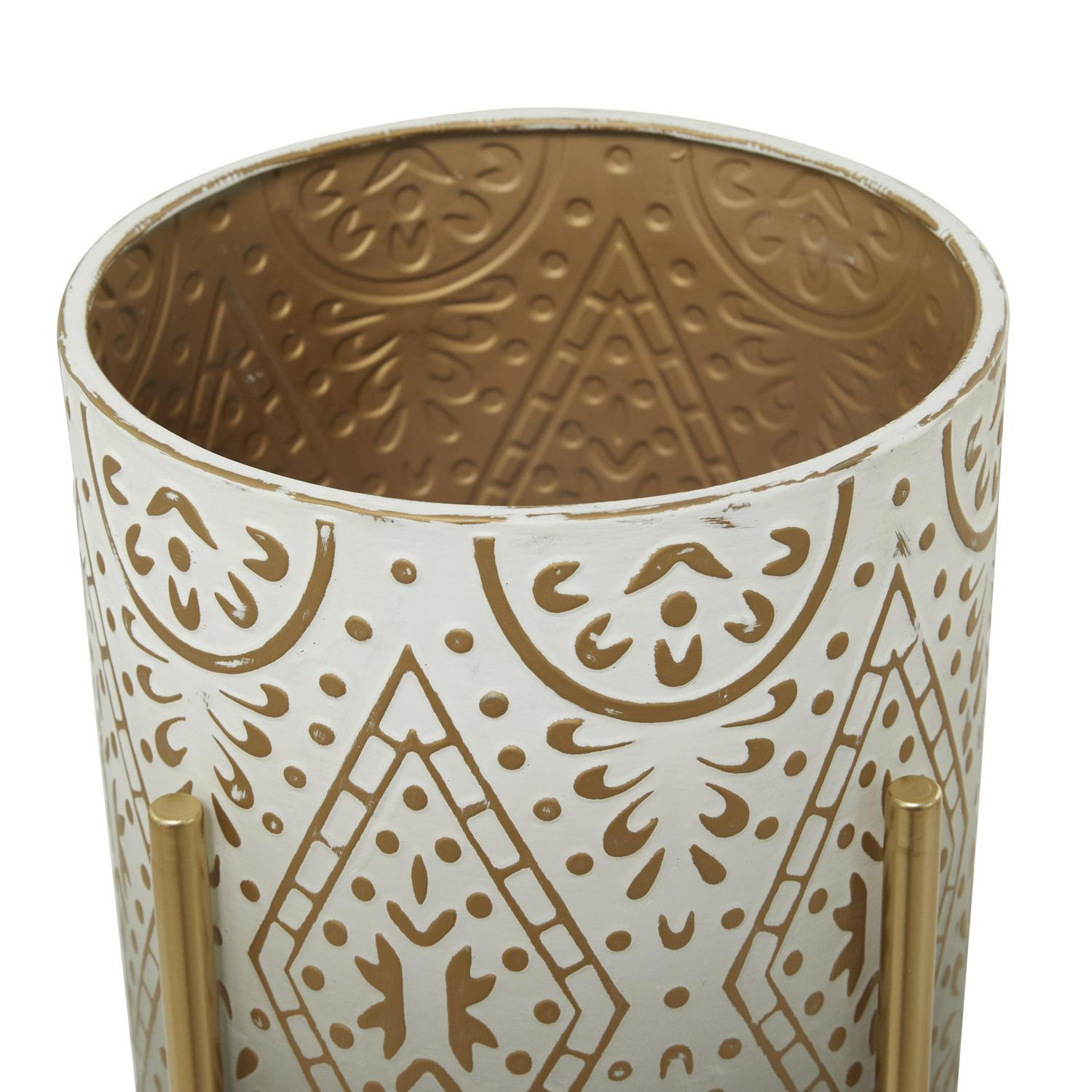 – Bohemian-inspired planters that feature brown and white metal cylindrical pots with abstract patterns mounted on gold open metal stands with x-shaped supports and rubber stoppers