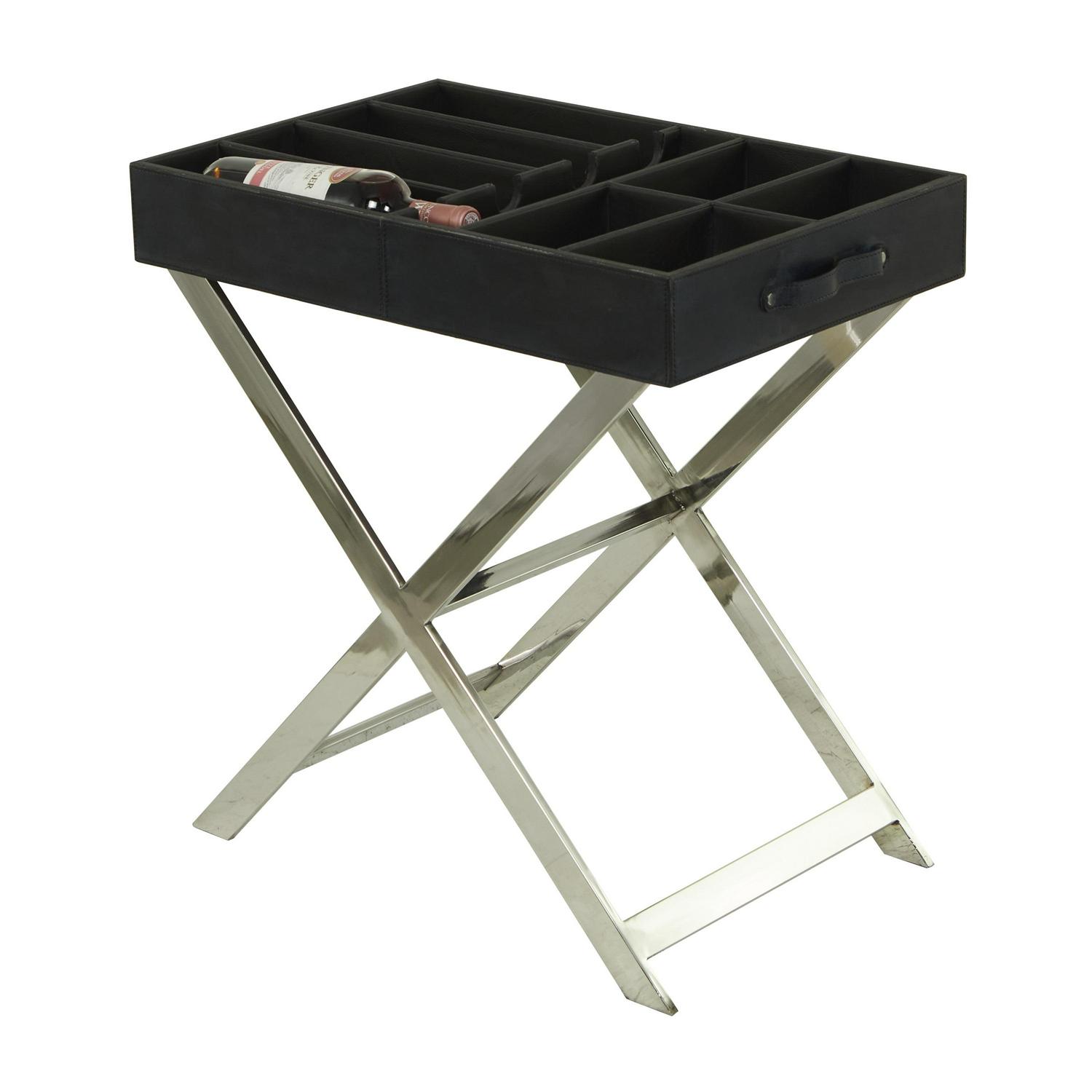 – This functional table inspired wine storage is furnished with a black leather exterior and a silver stainless steel stand