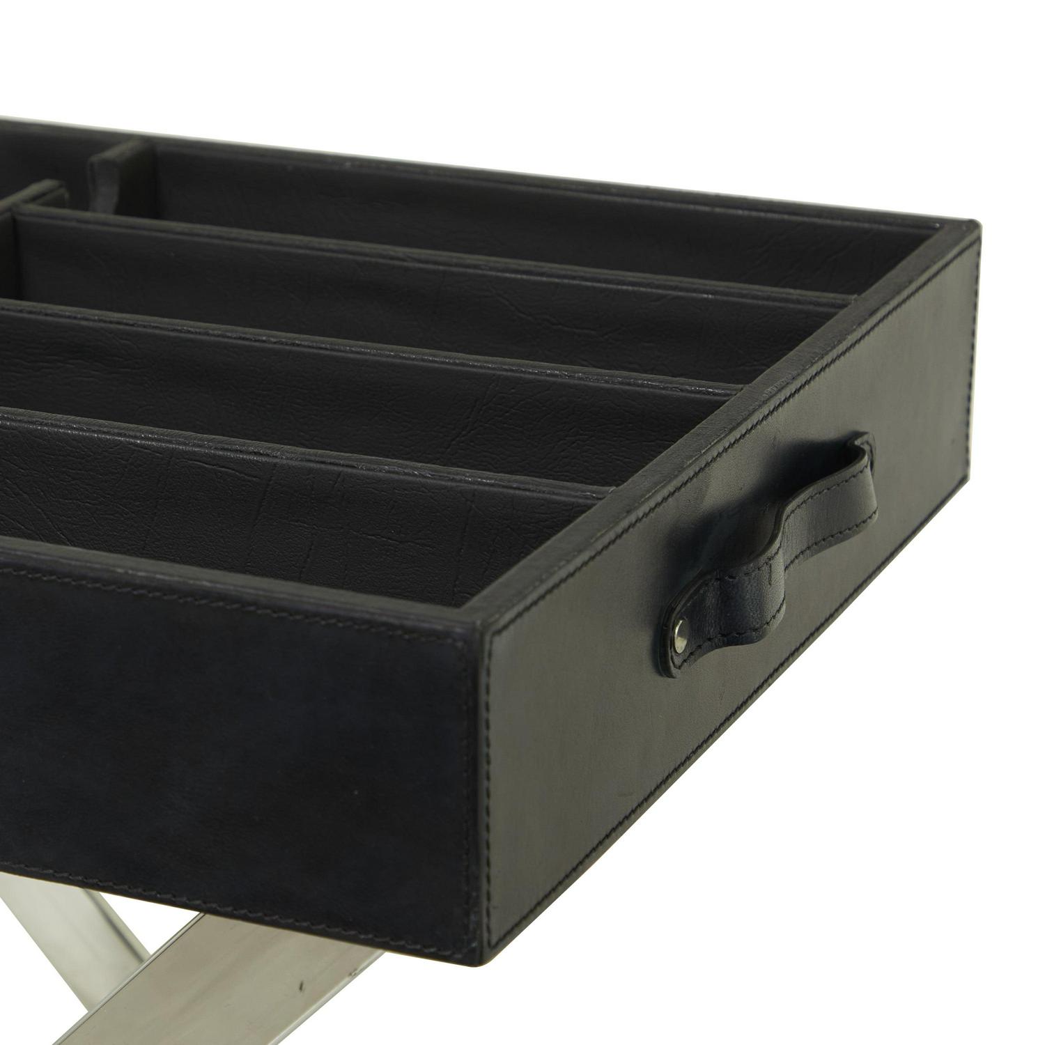 – The smooth rectangular leather wine storage is securely mounted on a sleek stainless steel stand
