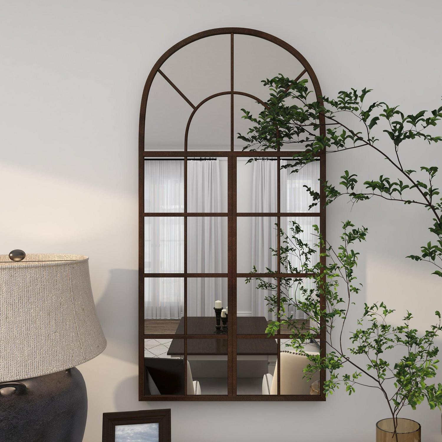 DecMode 24 x 48 Brown Window Pane Inspired Wall Mirror with Arched Top