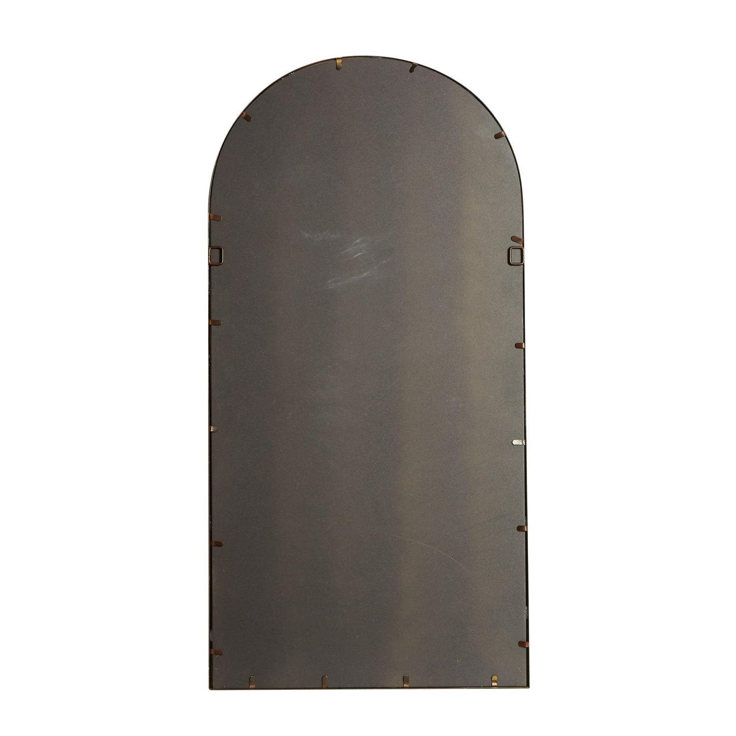 – This framed wall mirror has an elongated shape with an arched top and flat bottom